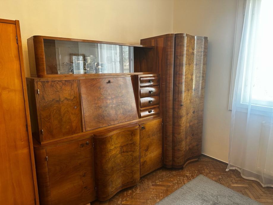 Prodajem stilski ormar i vitrinu izrađene od furniranog oraha s karakterističnim šarama drva koje su tipične za art deco period. Komplet se sastoji od vitrine s staklenim gornjim dijelom, sekretara s preklopnim pisaćim prostorom, nekoliko ladica te donjeg dijela s vratima za odlaganje. S desne strane nalazi se visoki zaobljeni ormar koji upotpunjuje cjelinu. Namještaj dolazi kao set i zajedno čini skladnu kompoziciju.