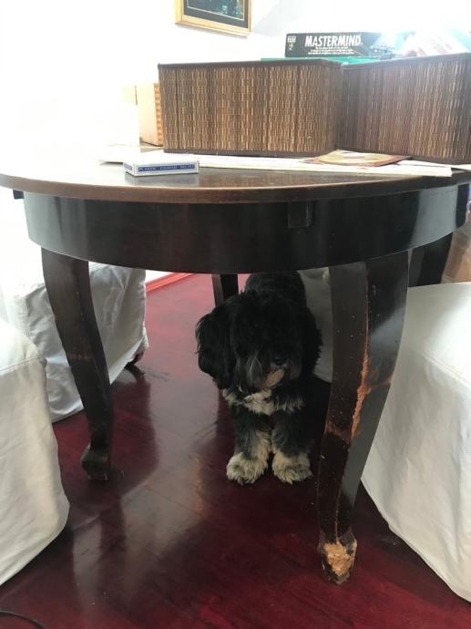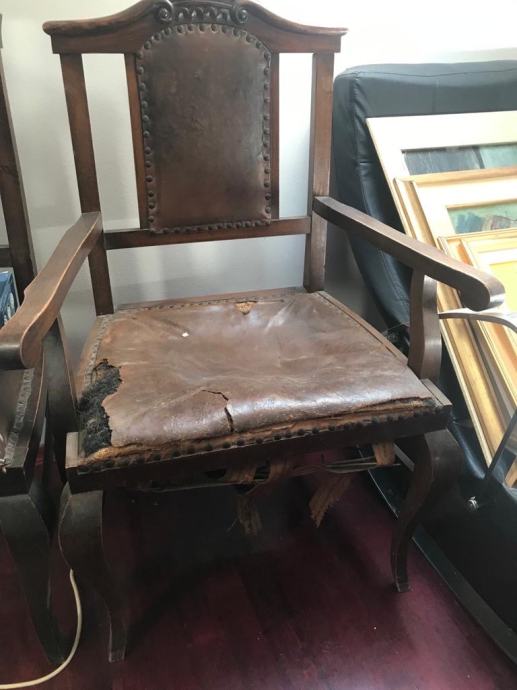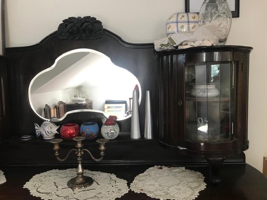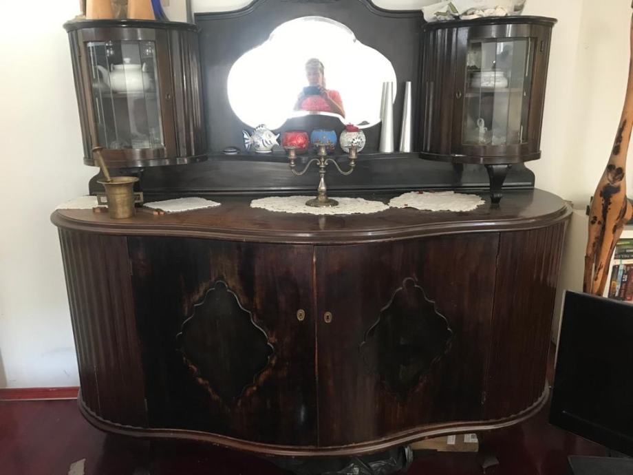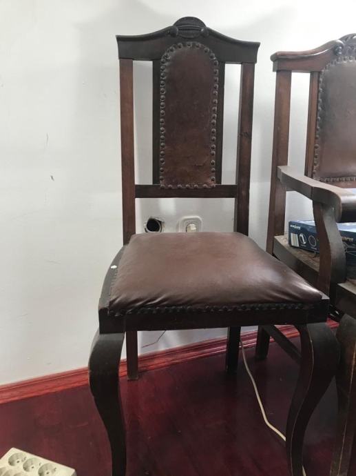 U kompletu se nalazi stol sa 6 stolica bez naslona + 2 stolice sa naslonom + veliki kredenc sa ogledalom i niski manji kredenc