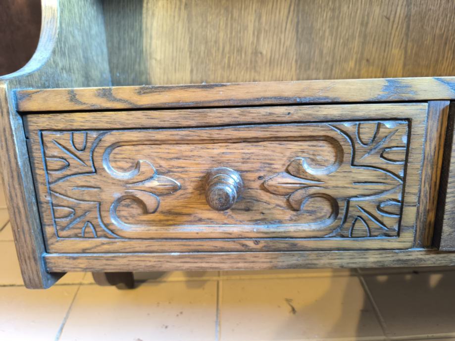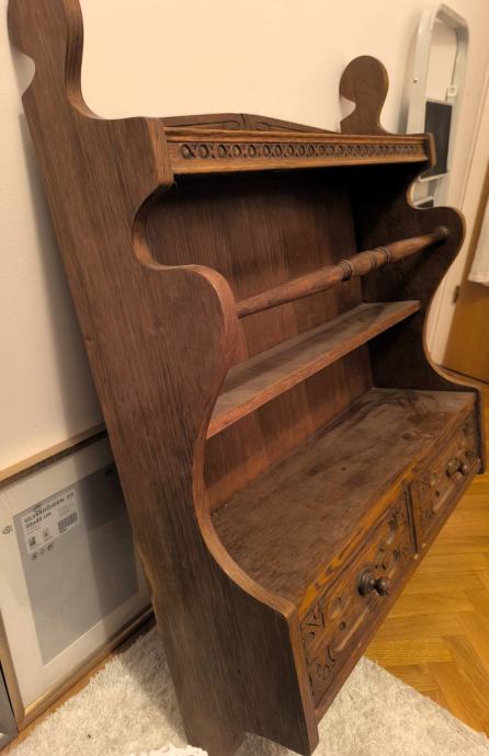 Prodajem starinsku zidnu policu smeđe boje od hrastovog drveta u rustikalnom etno stilu. Ima tri stalaže i dvije ladice i ukrašena je izrezbarenim motivima. Polica je usčuvana i nema oštećenja.