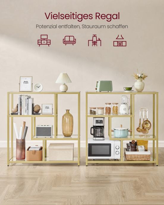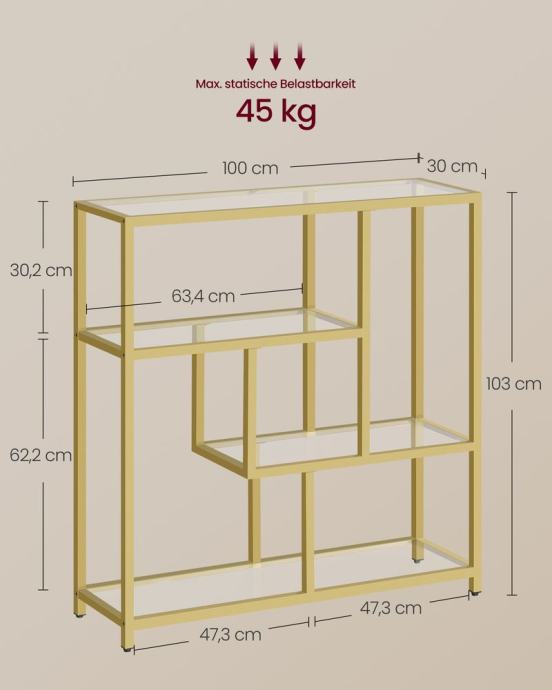 S dimenzijama od 30 x 100 x 103 cm, polica nudi 4 razine za vaše predmete, ali zauzima samo malo prostora. Maksimalno iskoristite svoj prostor s ovom stojećom policom. Visokokvalitetno kaljeno staklo i čelik zlatne boje čine policu za stepenice čvrstom, elastičnom (do 45 kg) i izdržljivom. Uključena zaštita od prevrtanja osigurava visoku stabilnost. 4 podesive noge povećavaju stabilnost. Zahvaljujući označenim dijelovima i jasnim uputama, stojeća polica može se sastaviti bez napora, tako da možete brzo izložiti svoje predmete. Samostojeća polica ima otvorene police različitih visina i prikladna je za izlaganje predmeta različitih veličina. Također vašem domu daje jedinstven i moderan šarm. Koristite ovu policu u radnoj sobi za pohranjivanje knjiga, u dnevnoj sobi za izlaganje ukrasa ili u spavaćoj sobi za izlaganje svojih fotografija - ova polica ima mnogo namjena. Za sve informacije nazovite na broj telefona 092/399-75-19