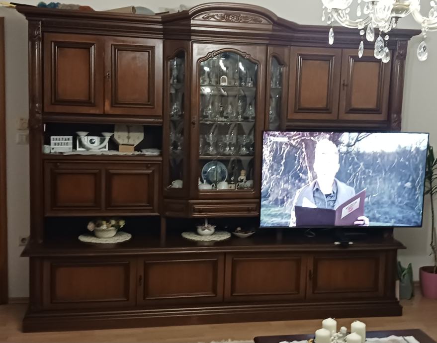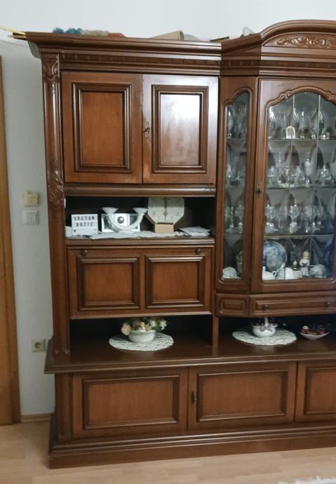 Regal s pretincima, s vratima i staklenim dijelom u sredini kao na slici. S osvjetljenjem (po želji). Regal je puno drvo Trešnja, vrlo uščuvan, održavan. Gdje je tv, je pretinac s dvoja vrata, a iznad prazni prostor kao na lijevoj strani. Nema oštećenja niti ogrebotina. Mogućnost pogledati bez obzira na kupnju.