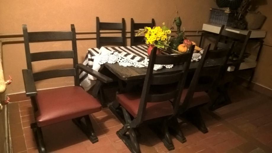 Rustikalni masivni namještaj,puna hrastovina,ručno rađen. Stol rezbarenih nogu,dim.140x90cm(razvučen 190x90cm. Stolice,6 kom,tapicirano sjedalo povoljno prodajem.