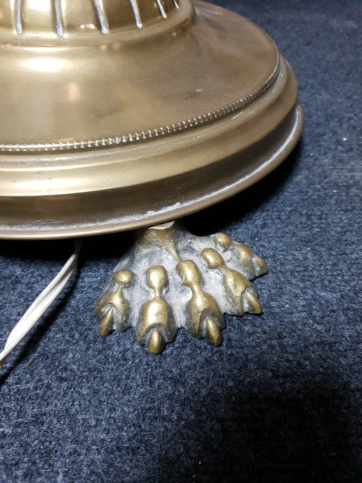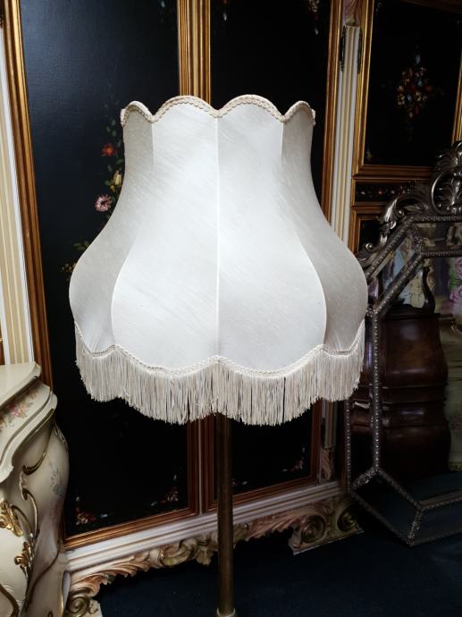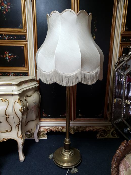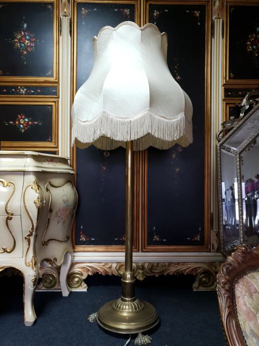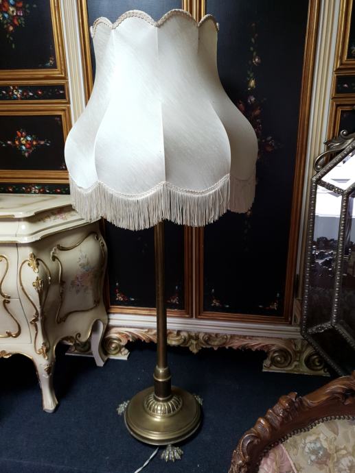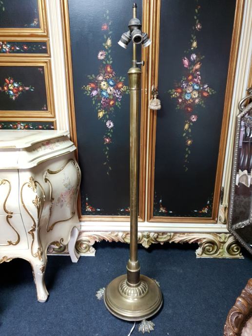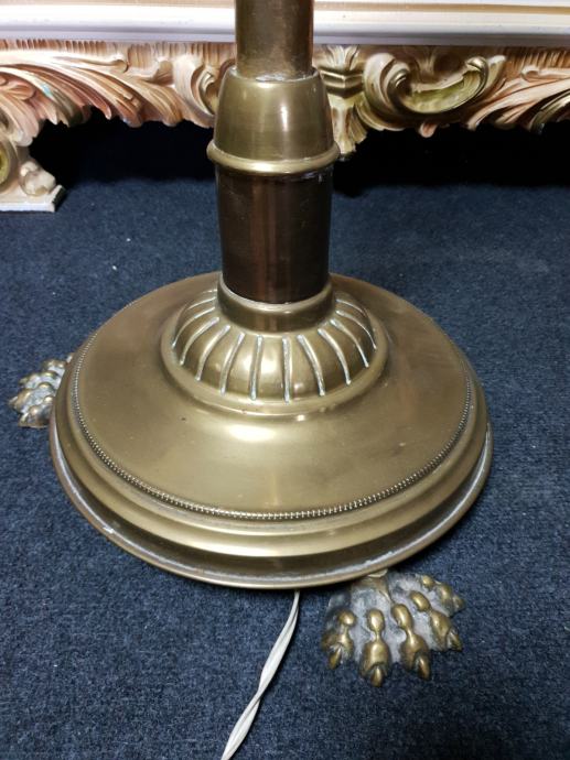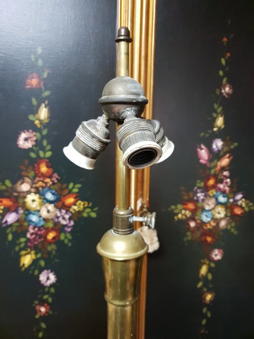 Samostojeća mesing lampa s lijepim sjenilom, tri rasvjetna tijela, ukupna visina lampe s sjenilom je 140cm, promjer sjenila 62cm, promjer postolja lampe 38cm.
