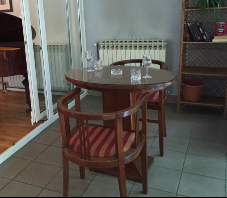Stol je ovalan i ima staklo, čvrst kao i stolice, tkanina odlična