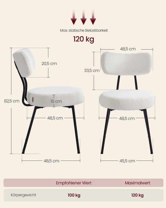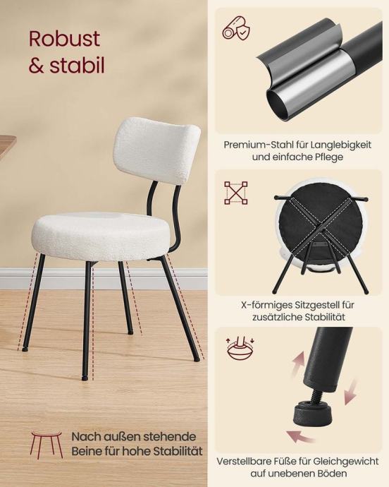 Elegantni, zaobljeni izgled ove moderne blagovaonske stolice lako se uklapa u različite stilove interijera i dodaje dašak elegancije vašoj blagovaonici, kuhinji, dnevnom boravku ili toaletnom stoliću. Zahvaljujući ojačanom čeličnom okviru, kuhinjska stolica može podnijeti do 120 kg; a robusna konstrukcija obećava dug vijek trajanja stolice. Blagovaonska stolica se može brzo sastaviti zahvaljujući jednostavnoj strukturi. Provedite manje vremena sastavljajući, a više vremena uživajući u svojoj novoj udobnoj stolici. Utonite u 10 cm debeli jastuk sjedala i široki, udobni naslon prekriven mekim flisom. Bilo da se radi o večeri ili igrama, ove stolice uvijek pružaju trajnu udobnost. Podesive nožice omogućuju da tapecirana stolica ostane stabilna čak i na neravnim podovima, a istovremeno štite vaše podove od ogrebotina – fleksibilno podesiva i prilagođena podu! Za sve informacije nazovite na broj telefona 092/399-75-19