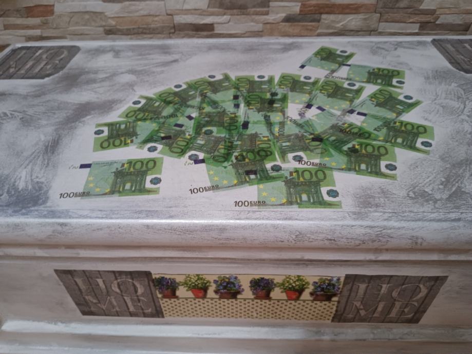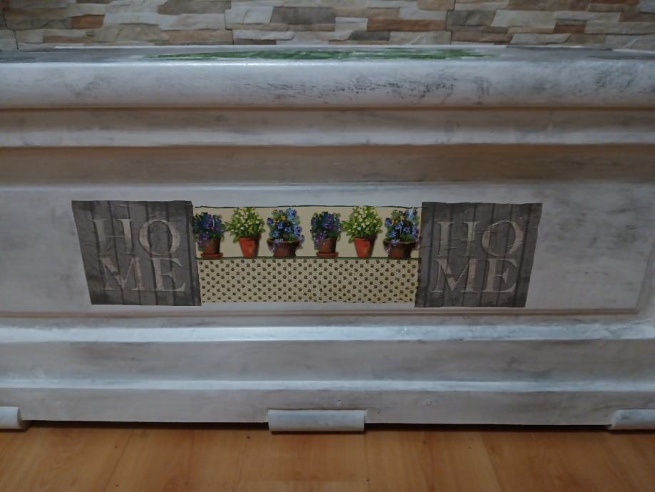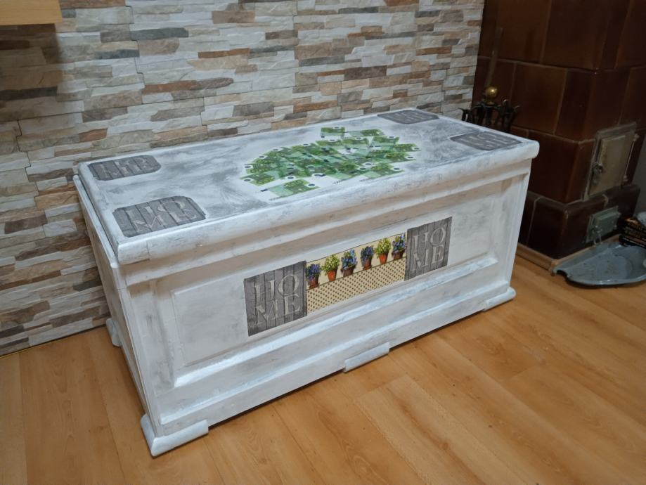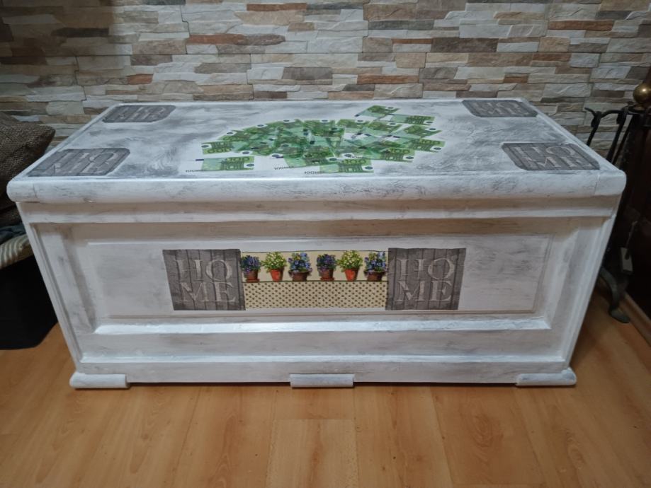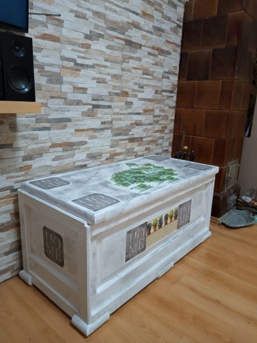 Masivna drvena škrinja,napravljena od masivnog punog drva,debljine 5.cm. Ručna izrada sa dekoracijom u decoupage i shabby chic tehnici,djeluje ukrasno u prostoru a gornji dio je idealan za sjedenje. Namjena je za odlaganje stvari,igračaka,posteljine,drva i drugo. Težina masivne škrinje je čak 45.kila a dimenzije su: