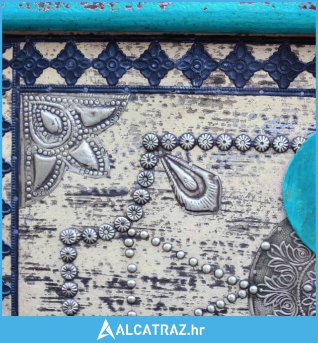 Izrađena je od mango drveta škrinja je čvrsta, izdržljiva i lijepa. Antički završni i dekorativni uzorci daju svakom komad svoju povijest i jedinstveni izgled.