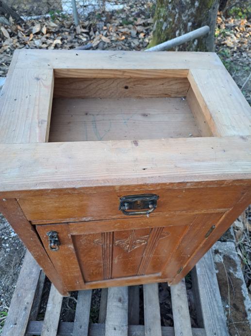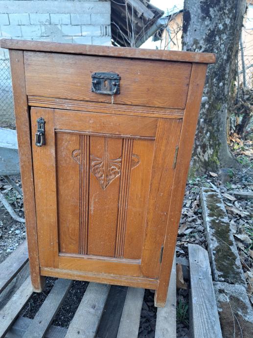 Namještaj je čvrst i stabilan, s lijepim rezbarenim detaljima i originalnim ručkama. Vidljivi su manji tragovi korištenja, ali je sve očuvano i funkcionalno. Idealan je za korištenje, kao i za restauraciju ili shabby chic preuređenje.