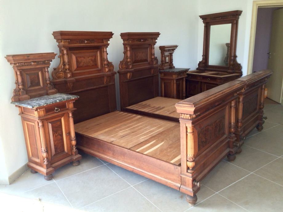 Prodaje se sve u kompletu s priloženih fotografija, dakle dva veća ormara, dva manja noćna/toaletna ormarića, komoda s ogledalom i dva kreveta u kompletu s uzglavljem, podnožjem i vezivnim daskama.