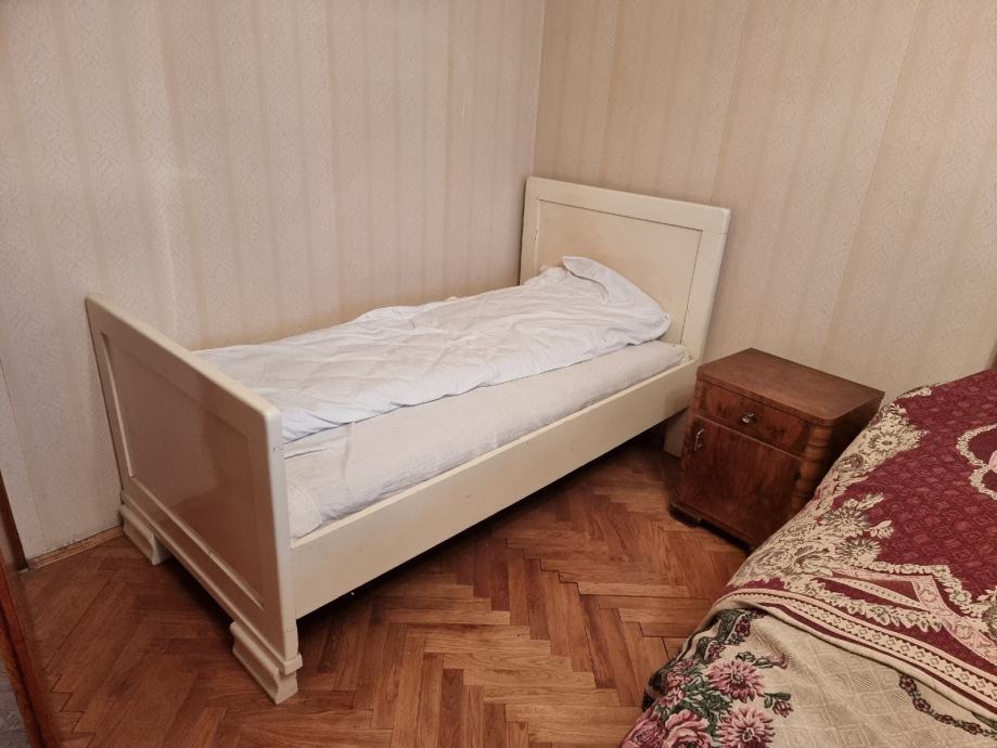 Spavaća soba sastoji se od bračnog kreveta, dva noćna ormarića, dva ormara, ogledala sa ormarićem i ladicama i malog bijelog kreveta.