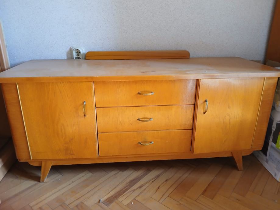 Starinska spavaća soba, 1 trokrilni ormar, 1 psiha, 2 noćna ormarića i pripadajući krevet bez madraca i podnica 180x190 (nije na slici jer je rastavljen). Pojedinačna kupovina nije moguća, spavaća soba se prodaje u kompletu. Namještaj se nalazi u stanu na četvrtom katu na Mlaci, moguće je samo osobno preuzimanje.