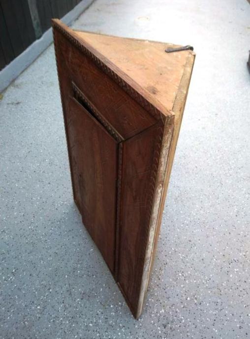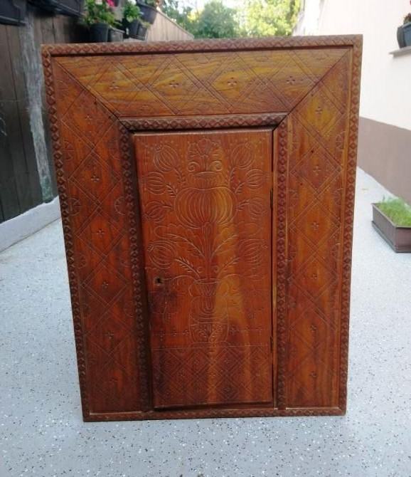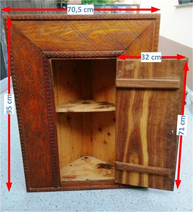 Prodajem starinski kutni viseći element, rezbareni, drvo bora, prema dimenzijama na slici.