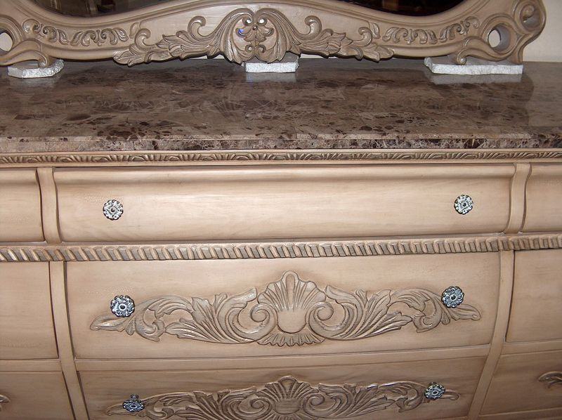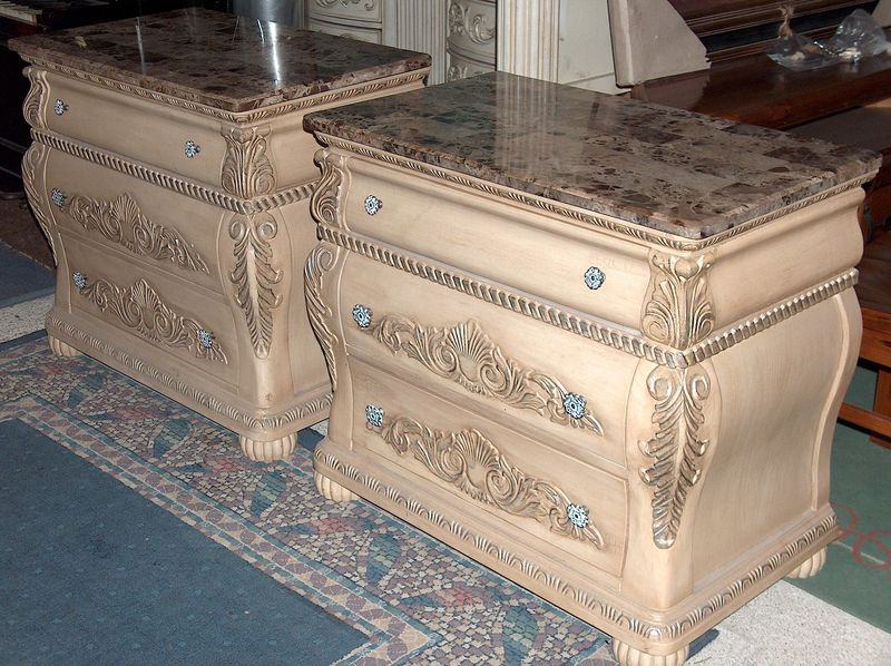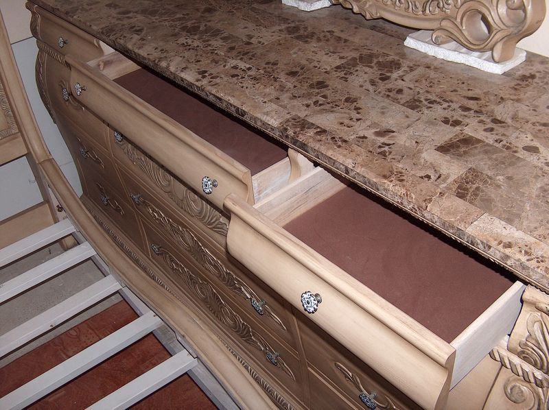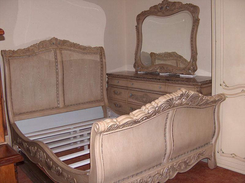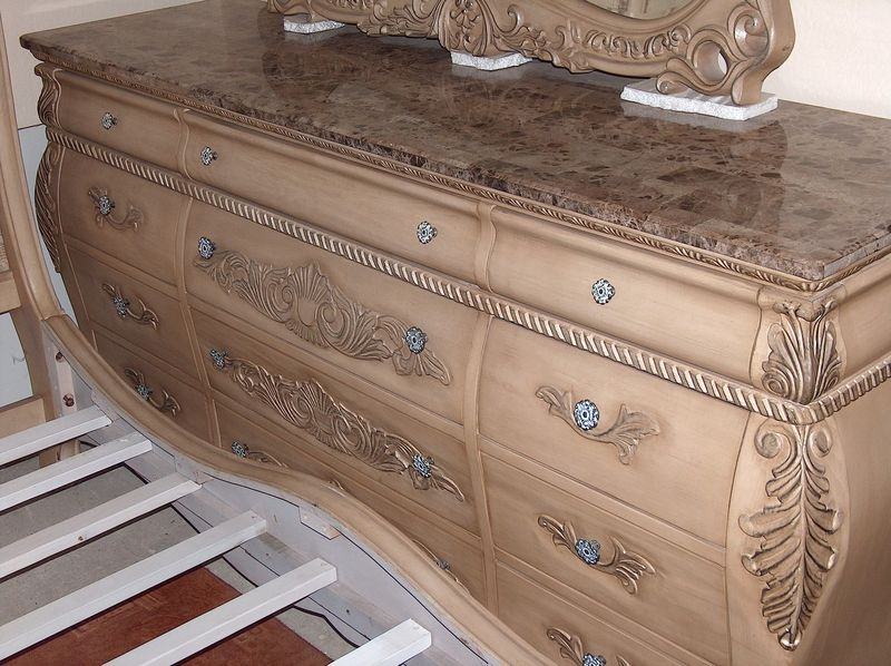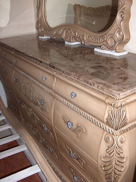 Kraljevska spavaća soba;krevet, psiha sa ogledalom i noćni ormarići,soba je stilski urađena u "antiquit white" boji,ogledalo je kristalno,a na psihi i ormarićima se nalazi kamen. Soba je nova i dovezena je iz Španjolske.