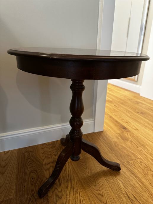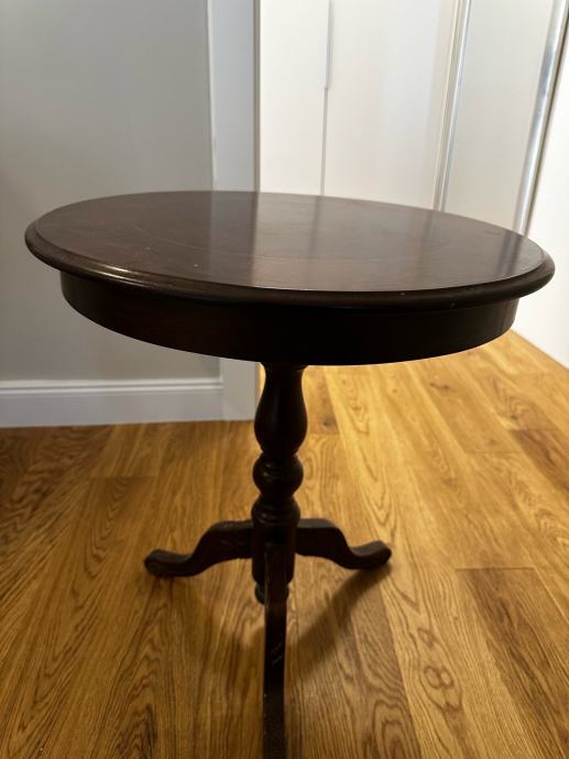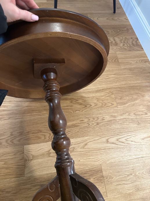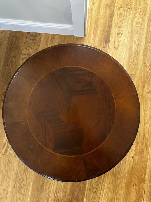 Prodajem očuvan okrugli pomoćni stolić klasičnog dizajna. Stolić stoji na elegantnom trokrakom postolju (tripod) s ukrasno rezbarenim središnjim stupom. Gornja ploča ima dekorativni detalj u dvije nijanse drva, što mu daje profinjen izgled.