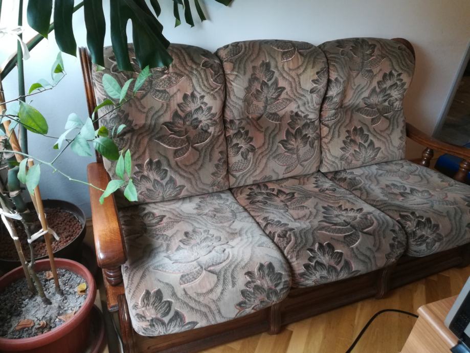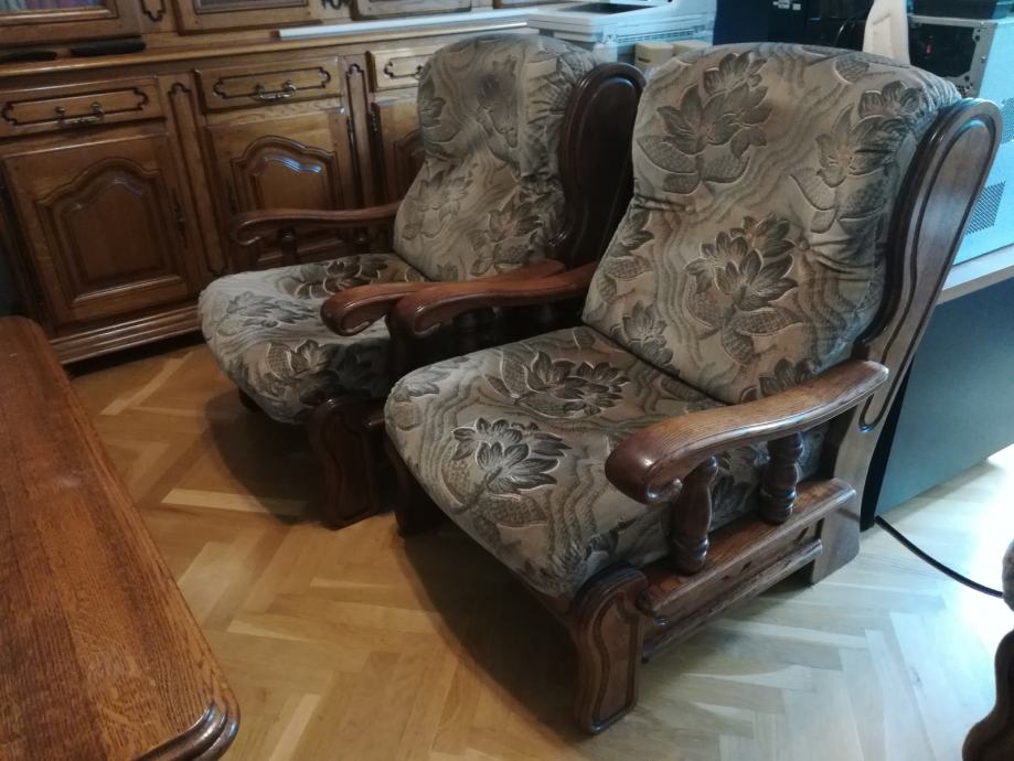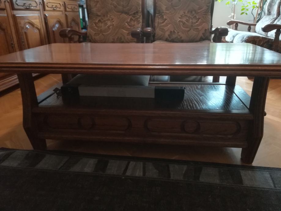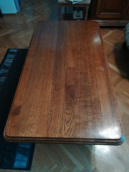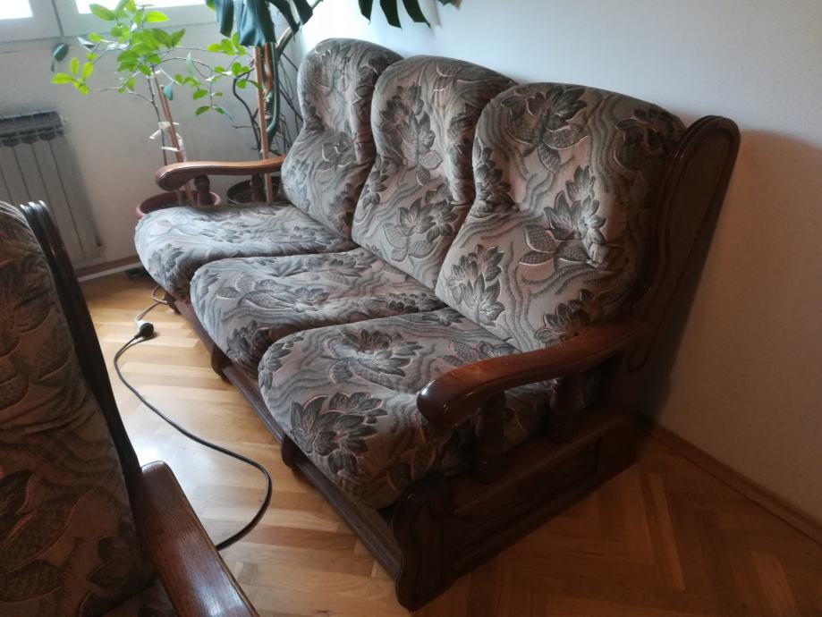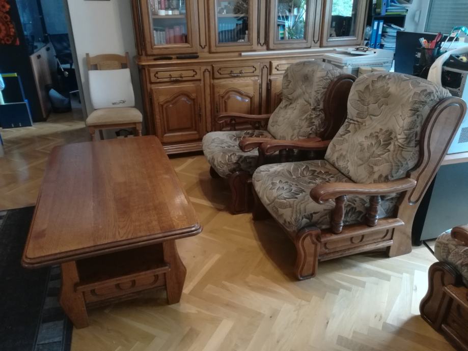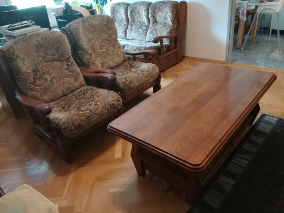 Stilski trosjed, dvije fotelje i stol za dnevni boravak iz 1980ih Bilokalnik - puno drvo hrastovina.