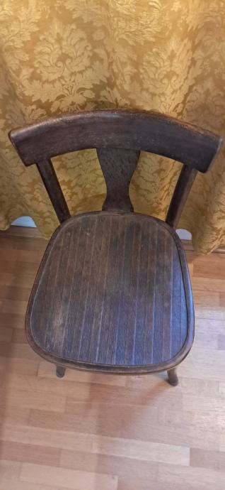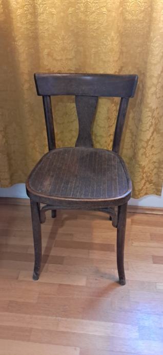 Stolica je izrađena od punog drva, stabilna i čvrsta, s očuvanom tvorničkom etiketom na donjoj strani. Na sebi ima lijepu patinu starine, bez pukotina i većih oštećenja.