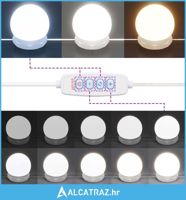 - Podesiva LED svjetla: Ovaj stolić za nakit ima LED svjetla oko ogledala. Možete jednostavno mijenjati između 3 boje svjetla (hladno, toplo i neutralno) te podešavati svjetlinu pomoću praktičnog upravljača.