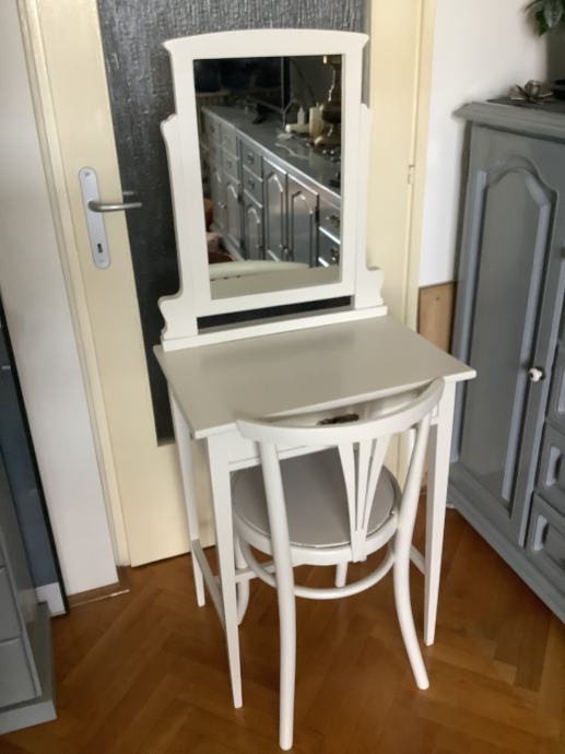Stari mali toaletni stolić sa stolicom. Ogledalo se može skinuti i może se naginjati.