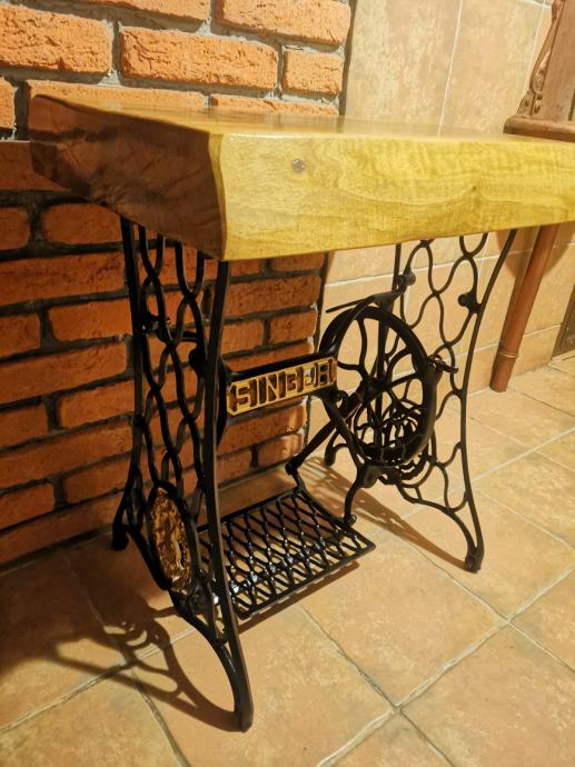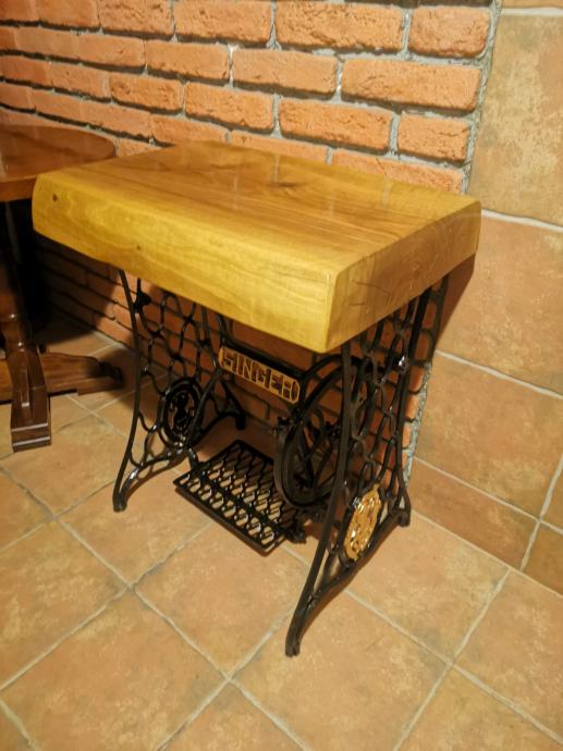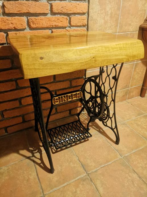 Prodajem unikat stolić. Postolje od stare šivaće mašine singer. Tabla orah debljine 10 cm ručno obrađeno. Sve nanovo ofarbano i lakirano.