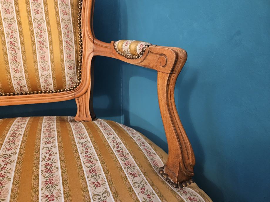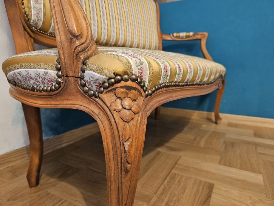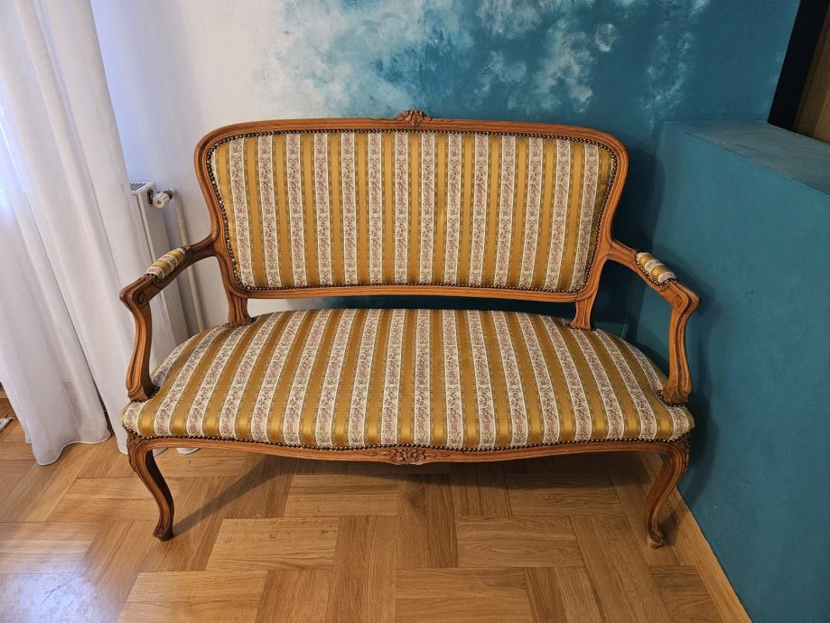 Prodajem vintage dvosjed izrađen u klasičnom stilu s bogatim drvenim okvirom od svijetlog drva. Drveni okvir ukrašen je ručno rezbarenim detaljima – cvjetnim motivima i elegantnim zakrivljenim nogama karakterističnim za barokni ili rokoko stil. Presvlaka je od tkanine u zlatno-žutim prugama s diskretnim cvjetnim uzorkom, a rubovi su učvršćeni dekorativnim metalnim zakovicama u brončanoj boji. Nasloni za ruke lijepo su oblikovani i udobni, a cijeli komad odaje dojam solidne, kvalitetne izrade.