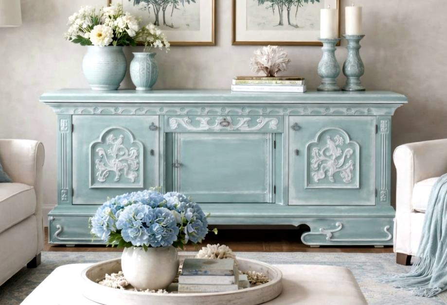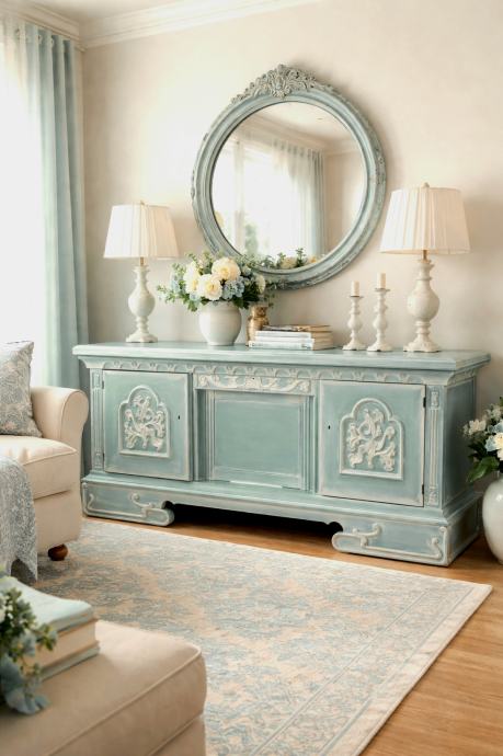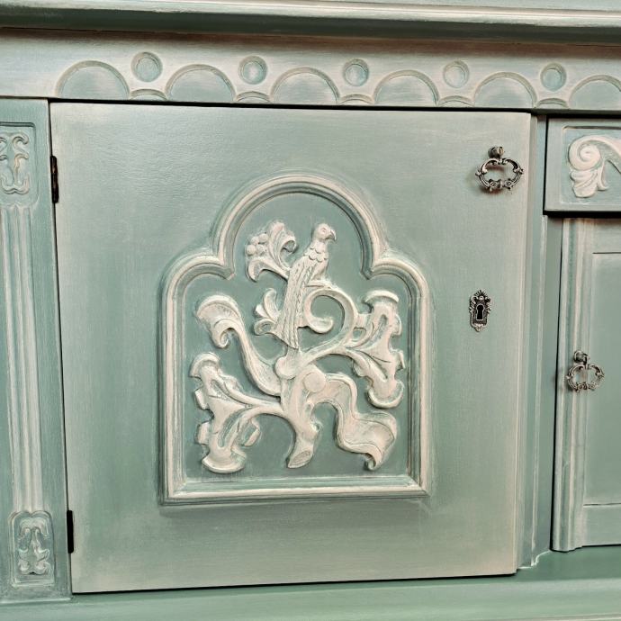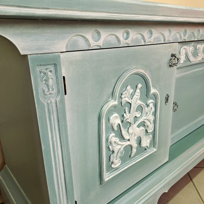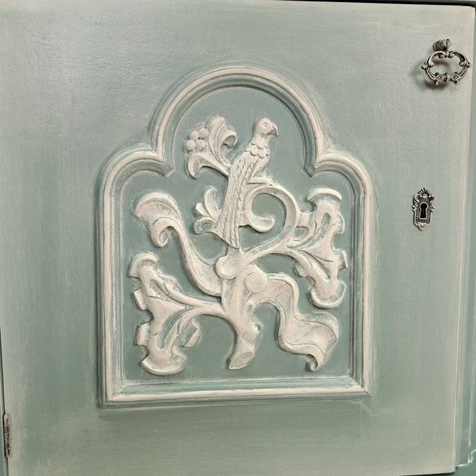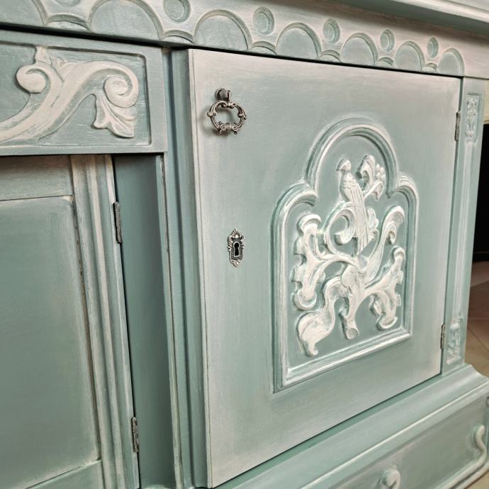 Prekrasna starinska komoda u plavozelenoj boji sa bijelom patinom.