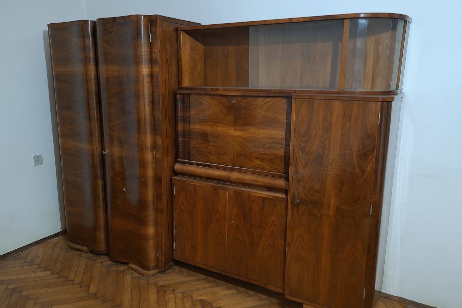 Prodajem starinsku komodu / vitrinu izrađenu od kvalitetnog orah furnira, u stilu sredine 20. stoljeća s art-deco elementima (zaobljeni rubovi, visoki sjaj, izražajna struktura drva).