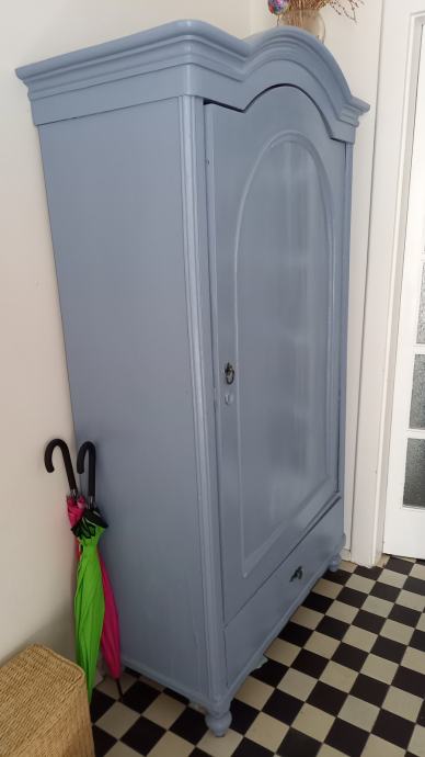 Ormar od punog drva, prostor za vješanje i jedna ladica. Dimenzije 181 cm visina, 50 cm dubina, 100 cm širina.