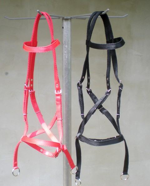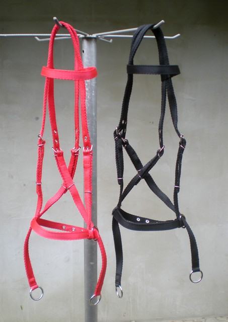 oglavine bez žvale, sintetičke, crne ili crvene, veličina L (full) ili M (cob). Kopče i karike su zavarene, rupice za kopčanje ojačane metalnim prstenom.