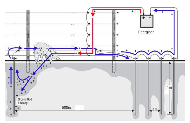 • Pravilo je da na jedan izlazni džul ide po jedan stup od 1m uzemljenja u zemlju. Stupovi se zabijaju oko uređaja na razmak od 3m i svaki stup treba biti povezan sa žicom sa crnim vodom. Zabijaju se svaki na različitom mjestu, u obliku lepeze oko električnog pastira.