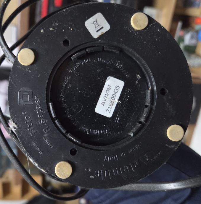 Dizajnerska stolna lampa.puklo svijetlo.treba zalemiti natrag.lagan popravak.lampa sve radi normalno kad se stavi gore i dodirnu kontakti.nova je preko 400 eura