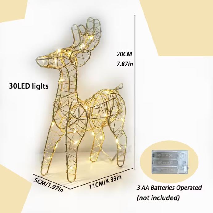 Glamurozna ukrasna lampa u obliku sobova od lijevanog željeza, 30 LED dioda, na baterije, AA baterija nije uključena, za božićne blagdanske ukrase