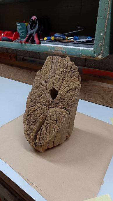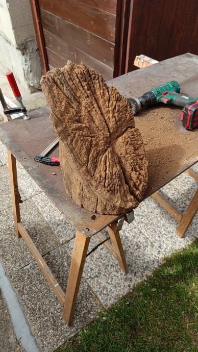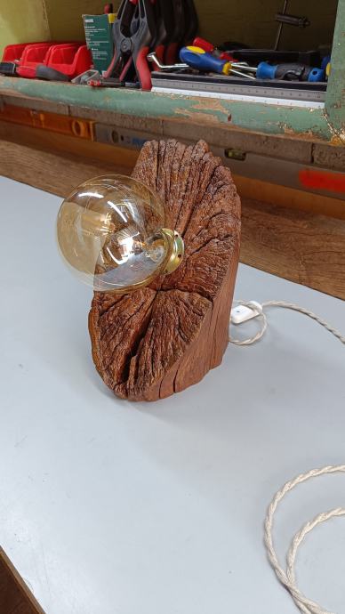Lampa napravljena od starog hrastovog panja. Panj je očišćen od nametnika i zaštičen uljem za drvo. Ugrađena je Osram Vintage 1906 žarulja. Strujni kabel je tekstilni, frkani dužine 2 m.