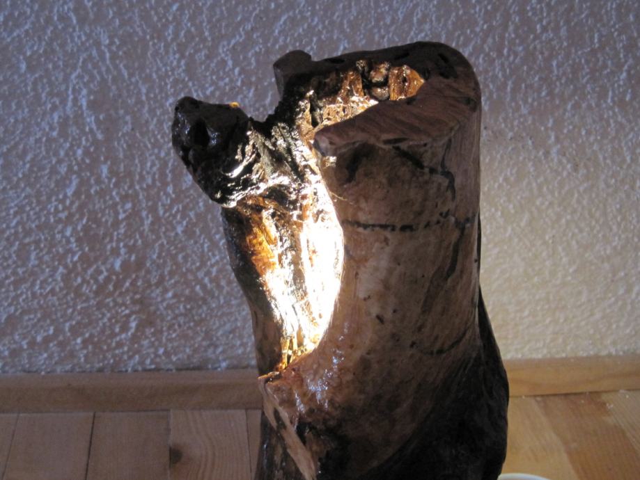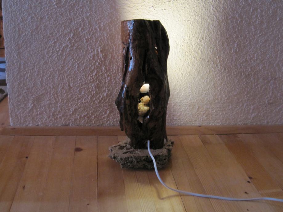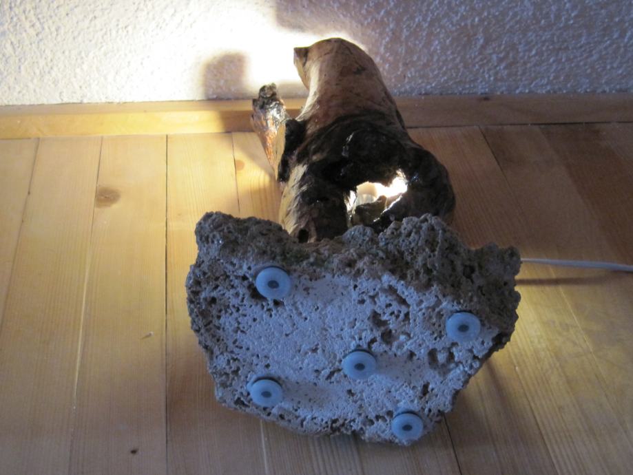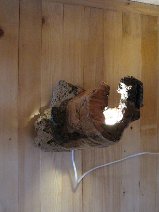Lampa je 100% prirodnih materijala . Tijelo je od starog šupljeg gloga lakiranog višekratno bezbojnim lakom . Grlo zajedno sa nosačom je pričvrćeno za dno lampe . Tu je još i kalcitno kamenje koje djeluje još dekorativnije , a stavljeno je da se ne vidi grlo i kabal . Žarulja je LED , zbog ugodnog svijetla , dugotrajnosti i jako malog isijavanja topline .. Postolje lampe je od sedre ( nekad davno izvađene iz riječnog korita .. Jedino umjetno na njoj su nožice koje su zaljepljene na dnu i sprečavaju oštećenje namještaja ..