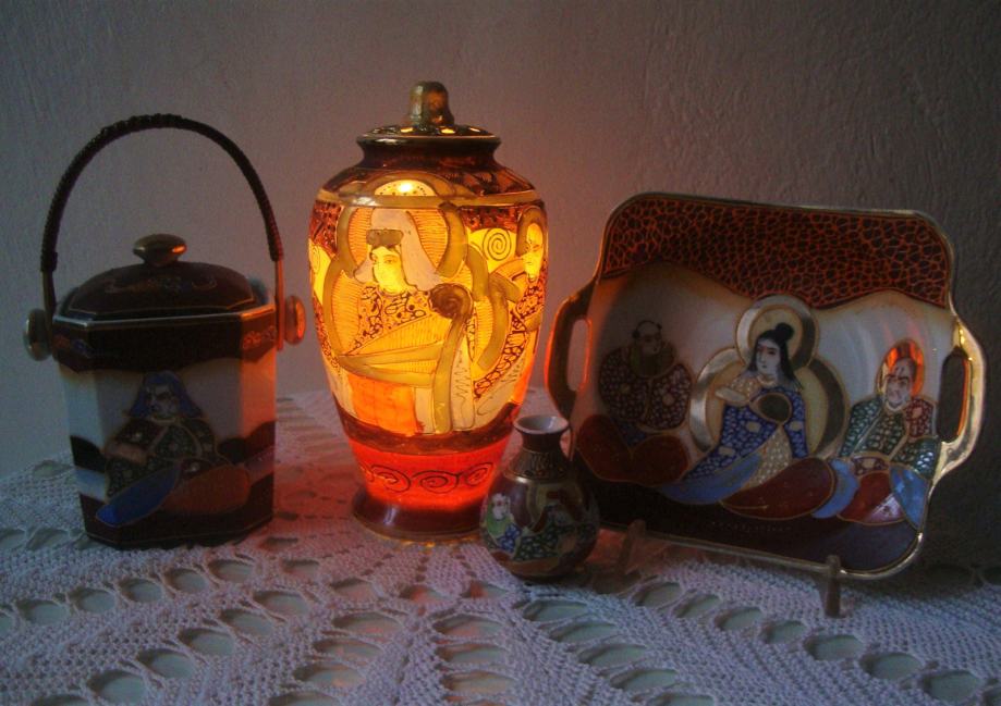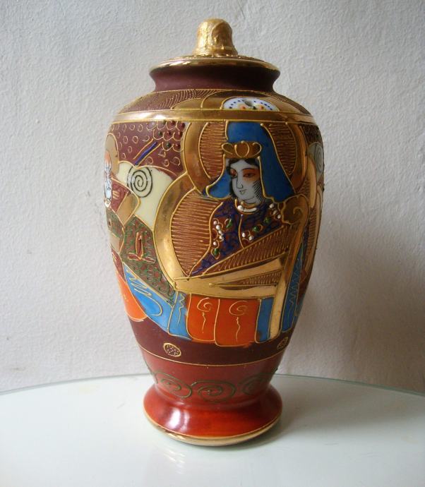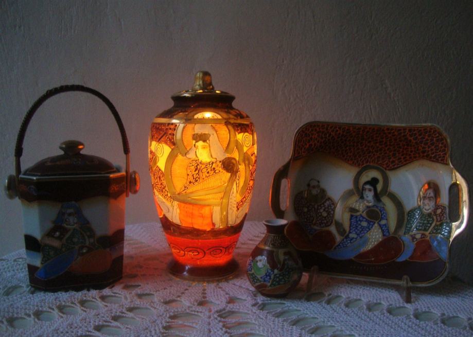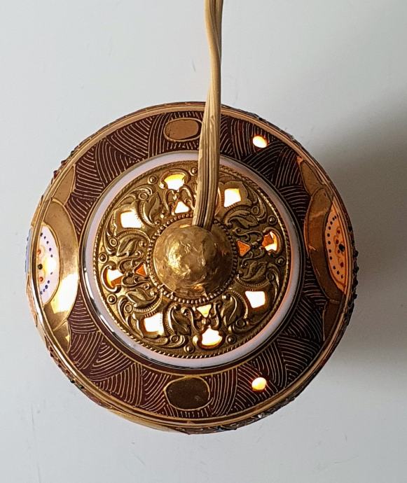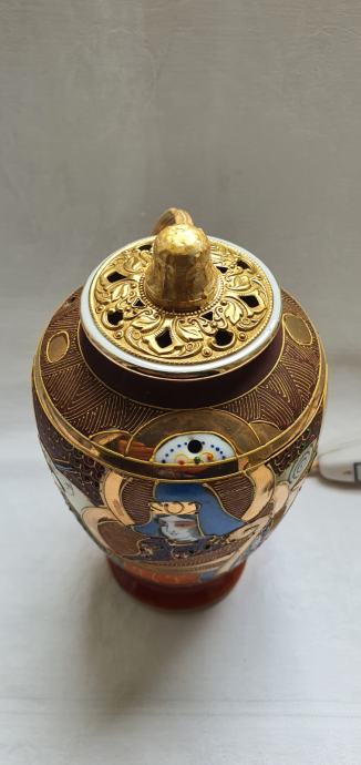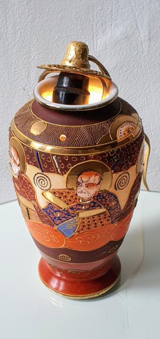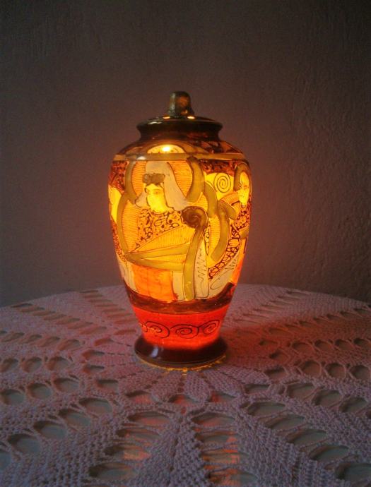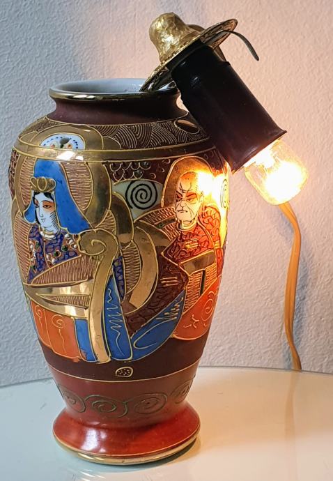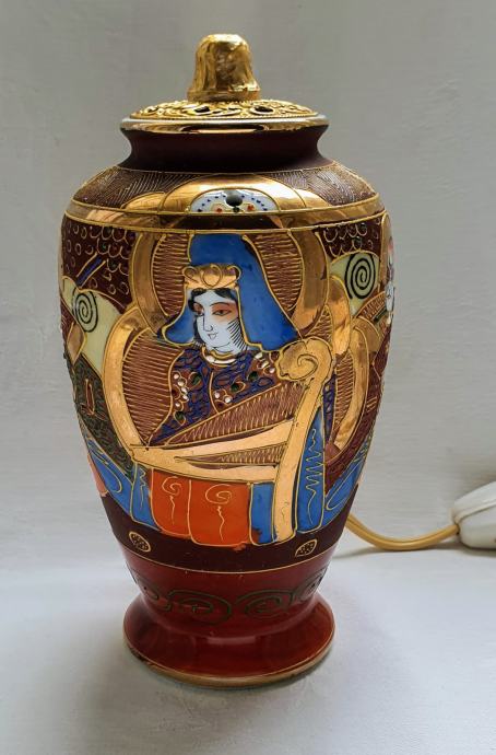 Vrlo lijepa i dekorativna stolna lampa ručno oslikana krasan tanki fini porculan motiv sa japankom caricom i carevima predivnih toplih boja i bogate 24kt pozlate, oblik amforasti vaza gonji metalni pozlaćeni dio na kojem se nalazi grlo sa rupicama kao i na rubu tijela vaze noćni efekt kao i za cirkulaciju topline žarulje od 15 w može i do 25 wati testirano grlo usko