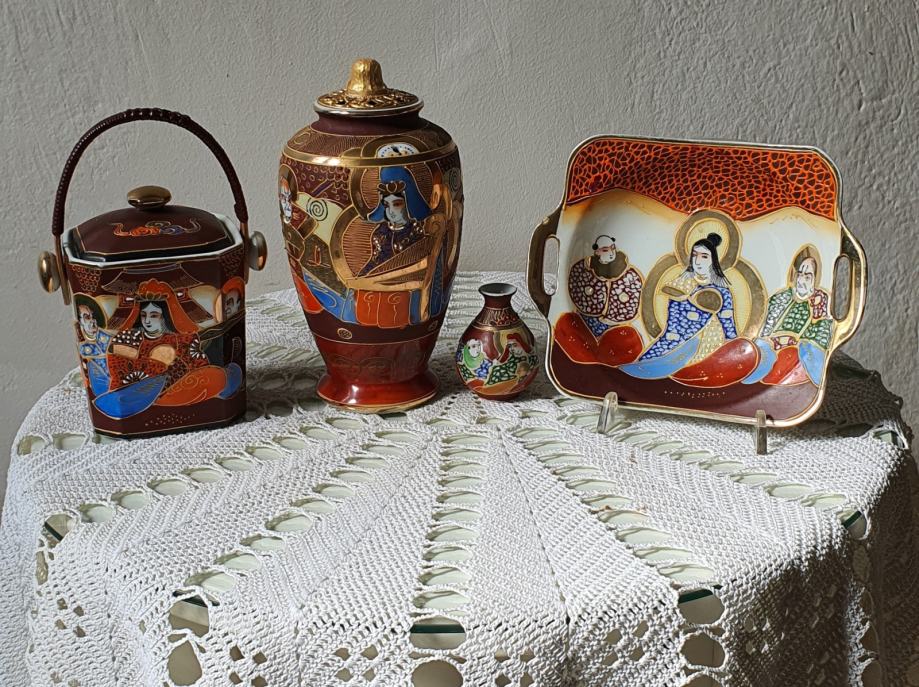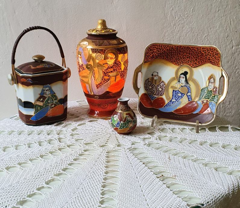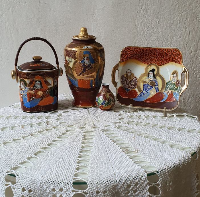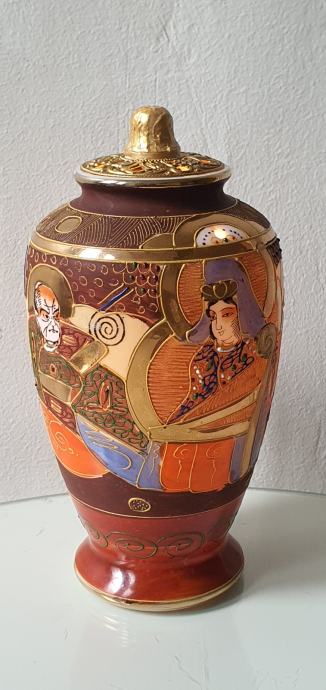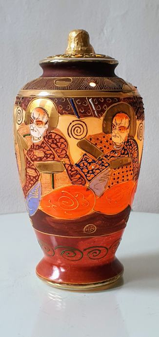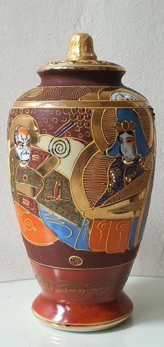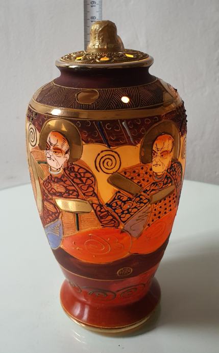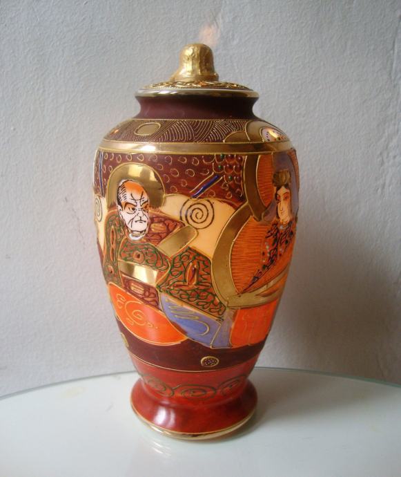 Vrlo lijepa i dekorativna stolna lampa ručno oslikana krasan tanki fini porculan motiv sa japankom caricom i carevima predivnih toplih boja i bogate 24kt pozlate, oblik amforasti vaza gonji metalni pozlaćeni dio na kojem se nalazi grlo sa rupicama kao i na rubu tijela vaze noćni efekt kao i za cirkulaciju topline žarulje od 15 w može i do 25 wati testirano grlo usko