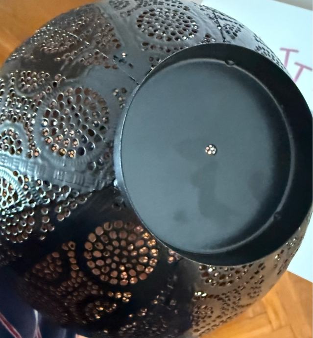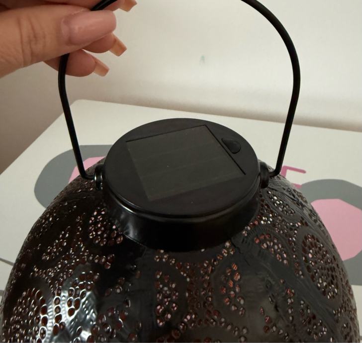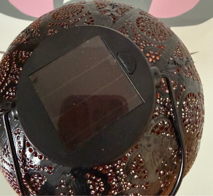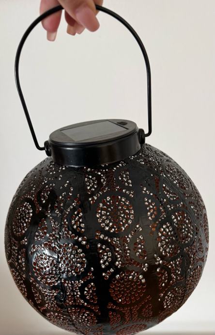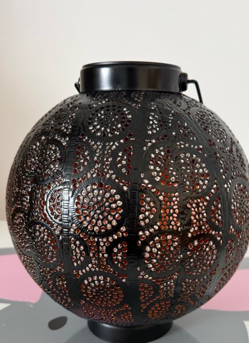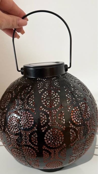 Prekrasna dekorativna solarna lampiona s efektom svjetlosti kroz uzorak, stvara ugodan ambijentalni ugođaj navečer. Idealna za balkon, terasu, vrt ili unutarnji prostor.
