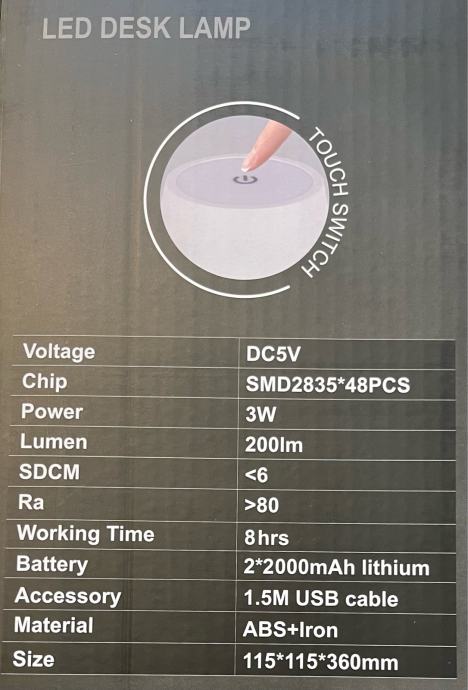 Stolna bežična lampa, autonomija rada 8 sati, vrijeme punjenja do 6sata.