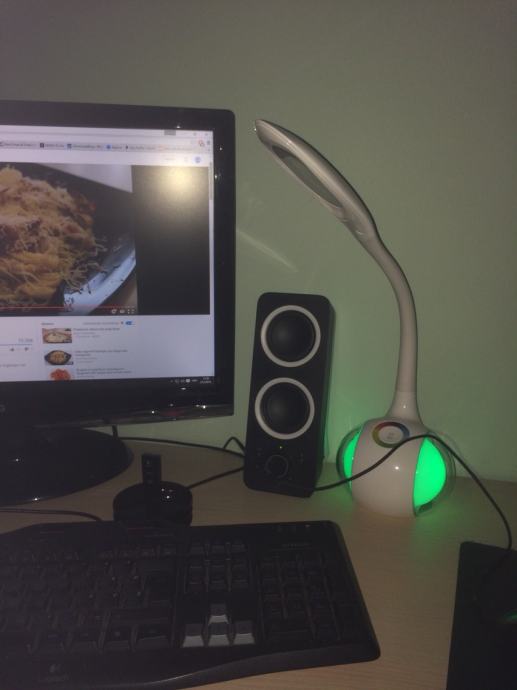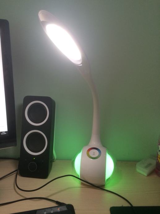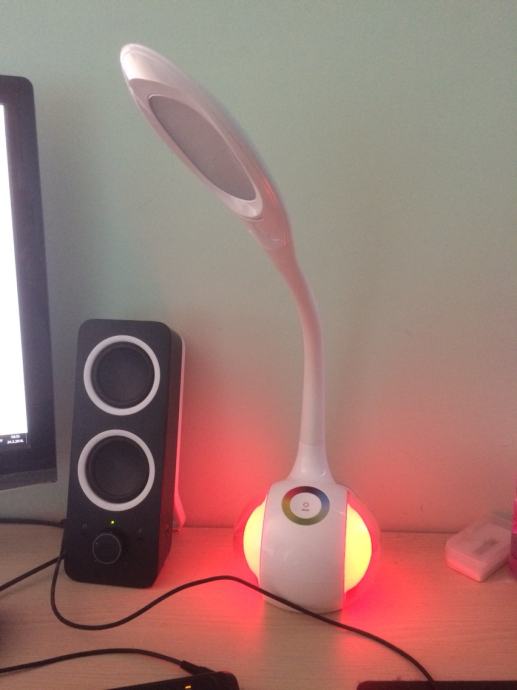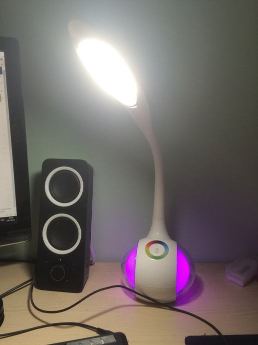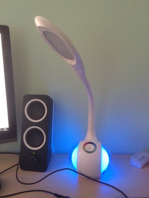 stolna lampa led moze svijetlit u 3 jacine... Dolje se mogu mjenjati boje kao sto se vidi na slici( ima oko 260 razlicitih boja) . Lampa dobivena na poklon. Samo isprobano.