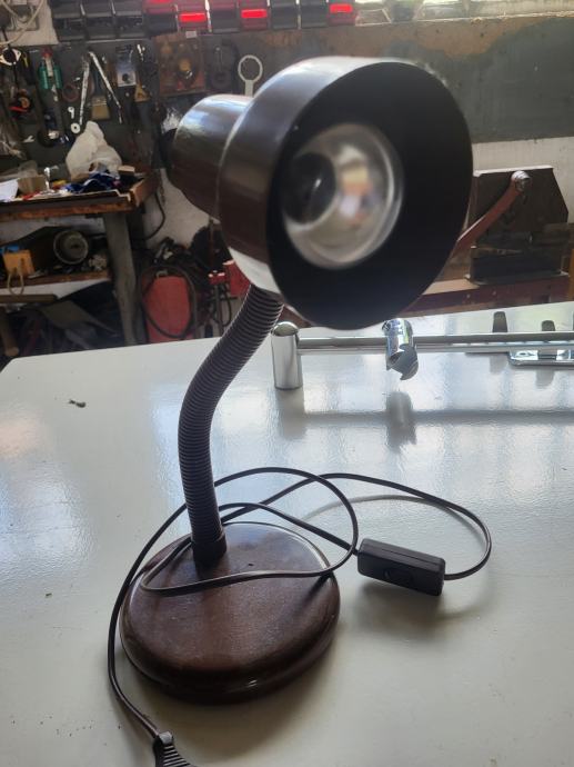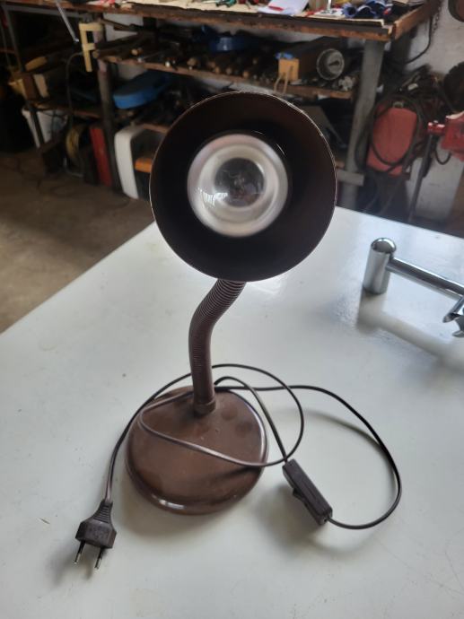 Metalna stolna svjetiljka, čokoladne boje, ispravna, uščuvana. Može za radni stol ili spavaću sobu. Savitljivo tijelo pa ju je moguće prilagođavati. Cijena nije konačna
