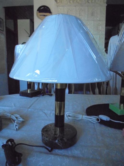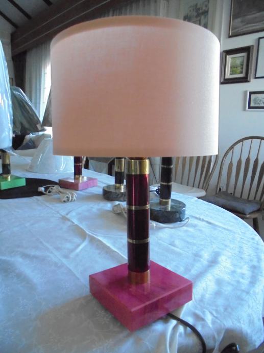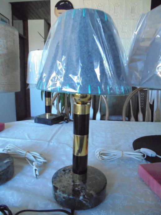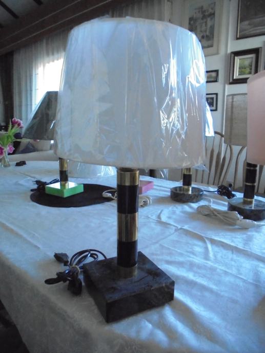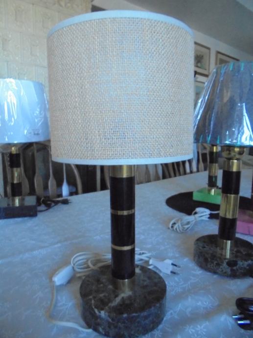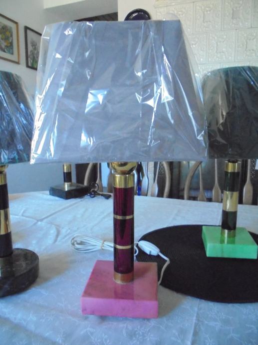 Prodajem stolne lampe, ručni rad, različitih veličina i boja. Visina "stupa" je 33 cm, podloge okrugle ili četvrtaste od umjetnog kamena crno-sive, zelenkaste ili crvenkaste boje. Cijena 20.- eura, a bez sjenila (širma) 10.- eura, na tel. 01/3771-598.