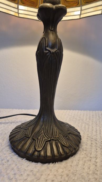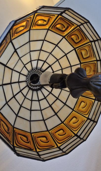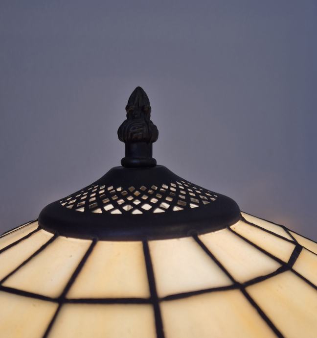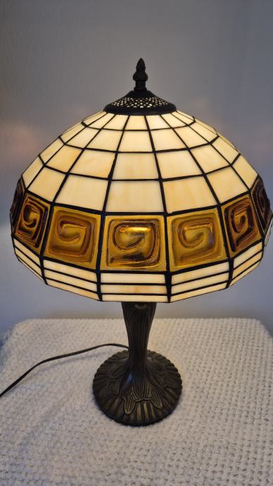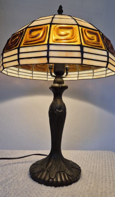 O PROIZVODU: Tiffany stolna lampa spoj elegancije i funkcionalnosti, visina 60 cm s impresivnim sjenilom opsega 117 cm. Izrađena je u toplim tonovima (mliječna bijela boja koja se prozire u kombinaciji s bojom jantara i ambera s ručno lemljenim detaljima koji tvore geometrijski uzorak. Baza je od teškog postolja s ukrasnim detaljima, što osigurava stabilnost i vintage estetiku.