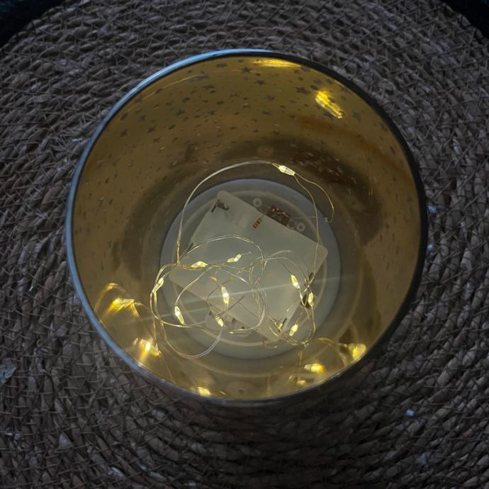 Prodajemo ukrasnu posudu sa žaruljicama unutar nje. Proizvod radi na 3 komada AA baterija (nisu u paketu).