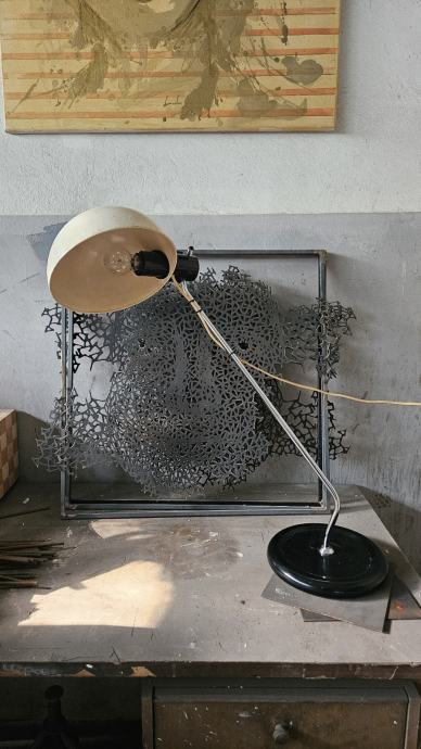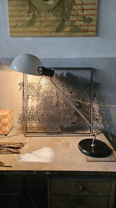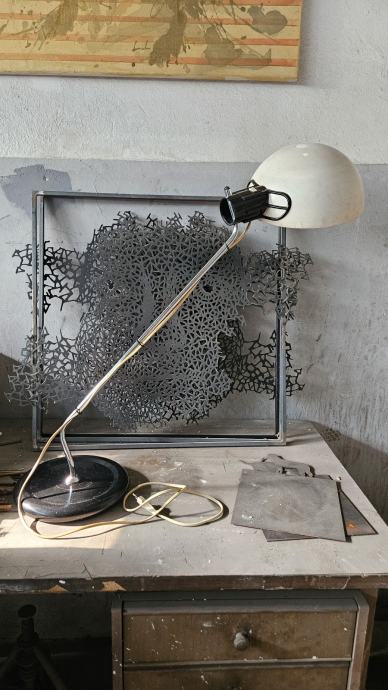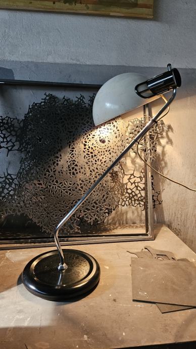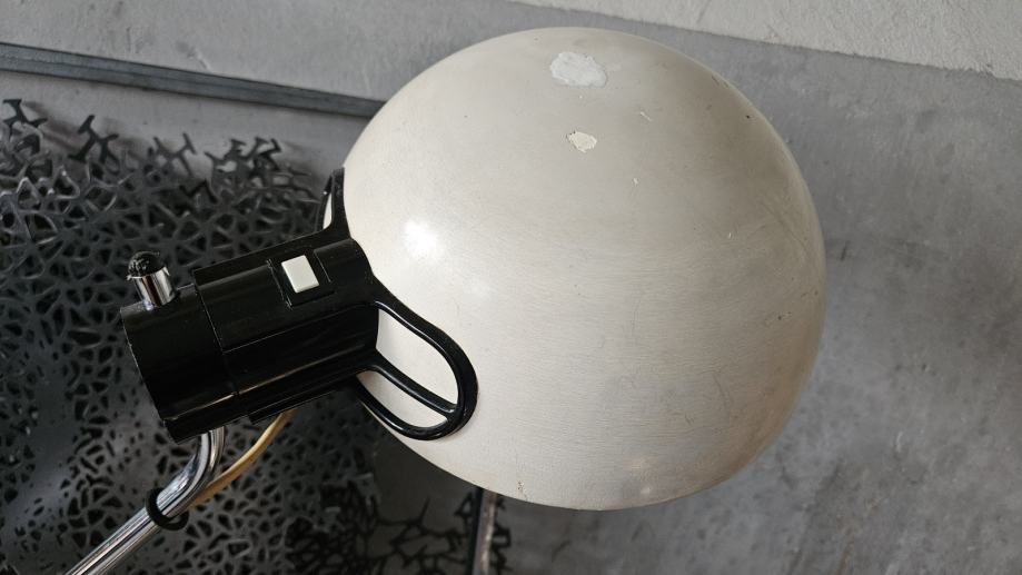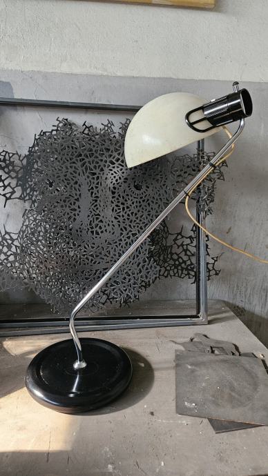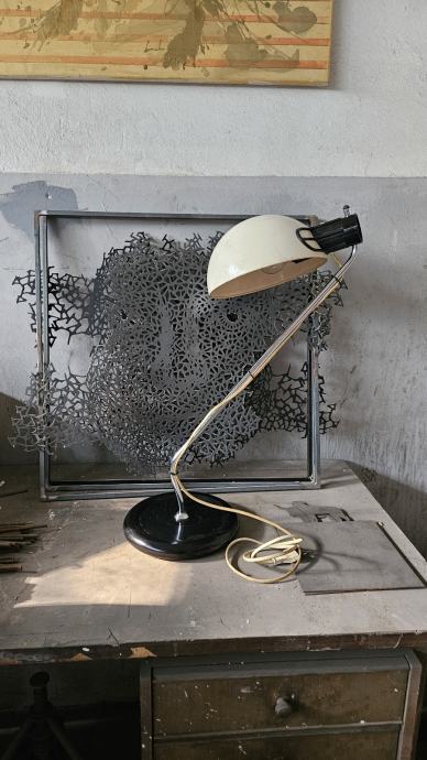 Stolna lampa "space age" stila sa kraja 60tih početka 70tih, dizajnirao Emilio Fabio Simion za Guzzini a proizvedena u tvornici Meblo Nova Gorica. Sjenilo je oštećeno ali se može popraviti (kit, brušenje, farbanje) ostalo je sve funkcionalno i u dobrom stanju.