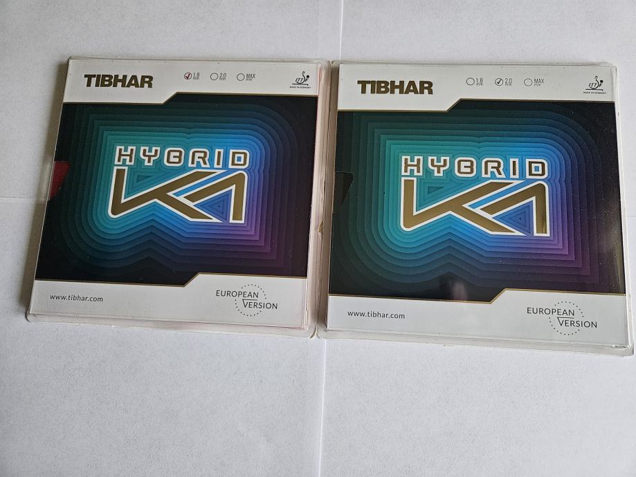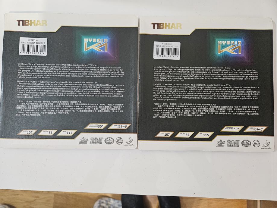 Nove zapakirane tensor gume za stolni tenis Tibhar HYBRID K1 european version, crna 2.0, crvena 1.8 mm, hardness sponge 50°, speed 107, control 85, spin 115. Odlične gume za svestrane (allround) igrače od defanzive do ofenzive s izvrsnom kontrolom. Na intern. trgovinama su cijene za par od 95 do 100 €.