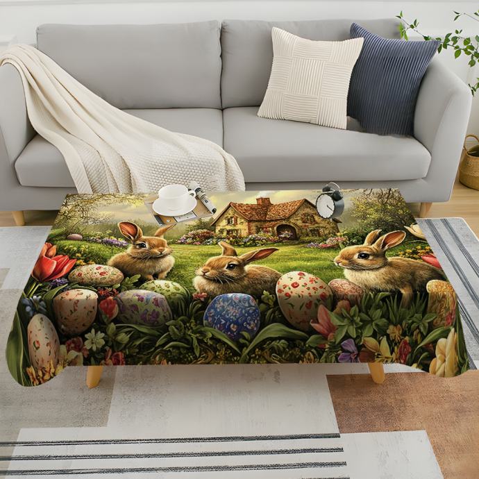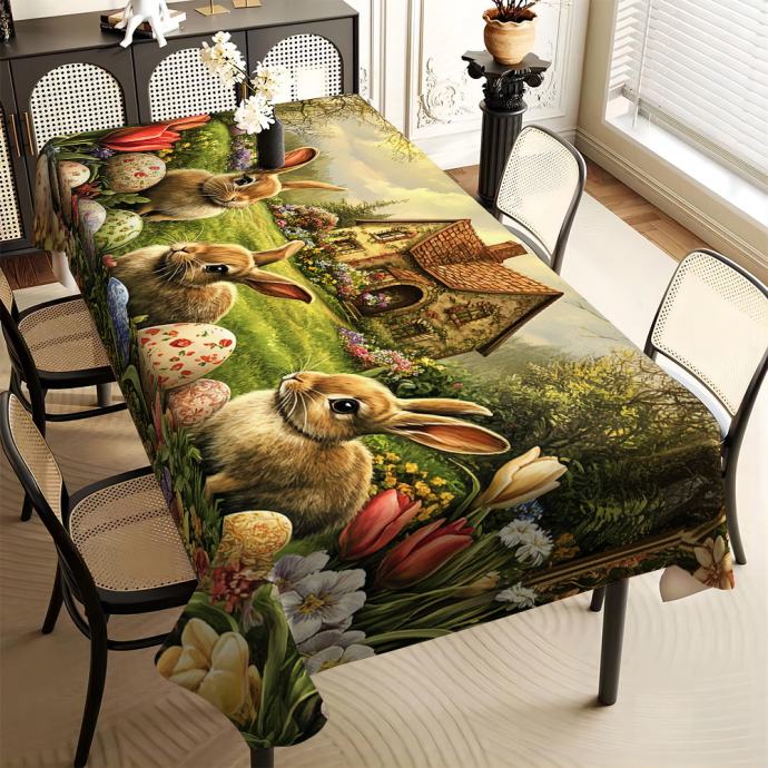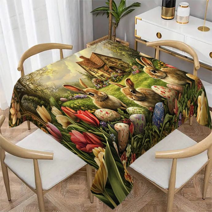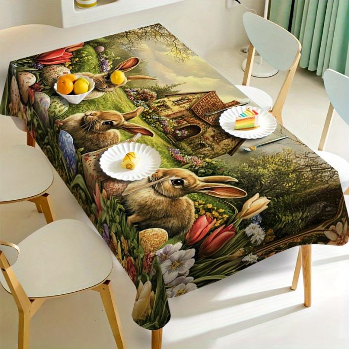 1 kom. stolnjak s uskršnjim zečićem i jajetom - svečani pravokutni stolnjak od poliestera sa zečevima, pilićima i proljetnim cvijećem za uređenje doma, blagdanske zabave i proslave, proljetni ukras za stol | Živahni stolnjak | Poliesterska tkanina