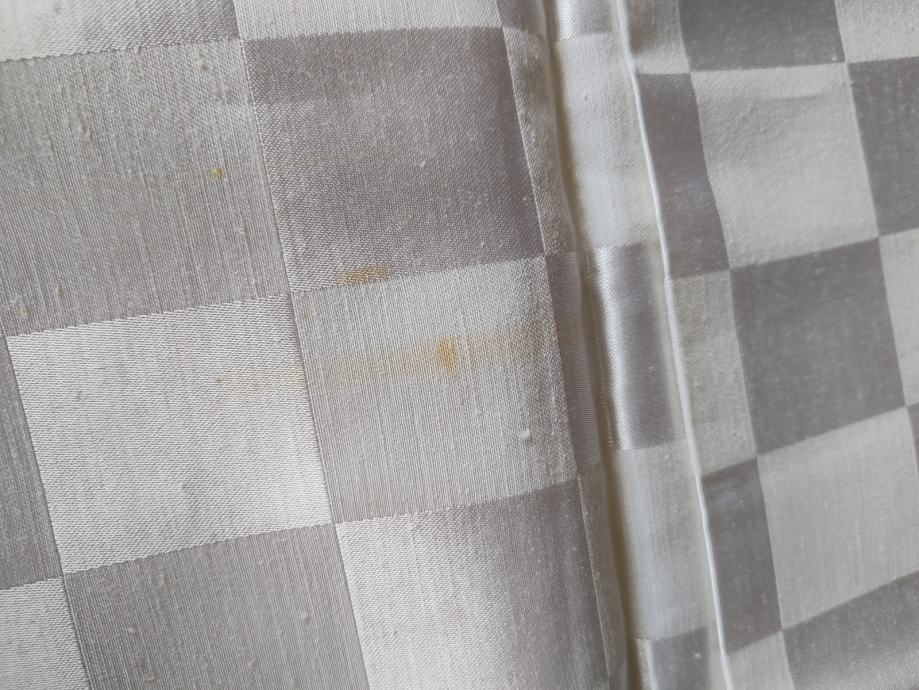 Stolnjaci su dimenzija cca 213 x 142 cm, za potrebe slikanja izvađeni iz vrećice, nikada rabljeni. Jedan od stajanja ima nekoliko žučkastih flekica, drugi je posve bijel, zato je cijena za oba stolnjaka toliko niska.