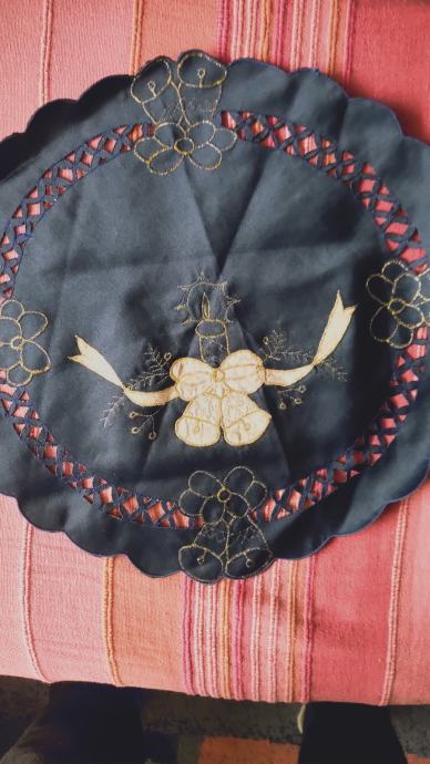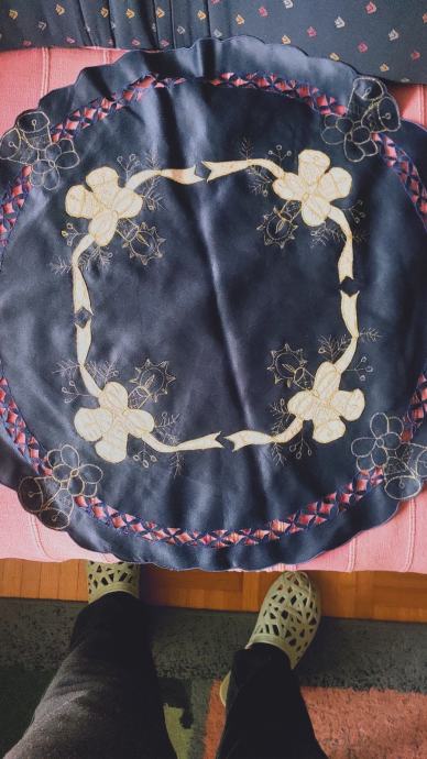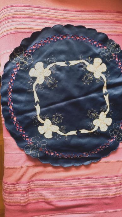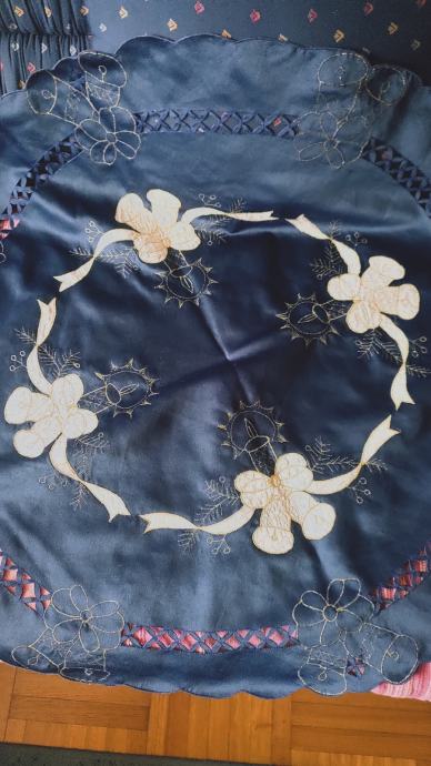 Komplet od tri blagdanska stolnjaka tamno plave boje s izvezenim cvjetnim vijencem. Najveći ima promjer 85 cm, srednji 58, a najmanji 40. Cijena se odnosi na sva tri