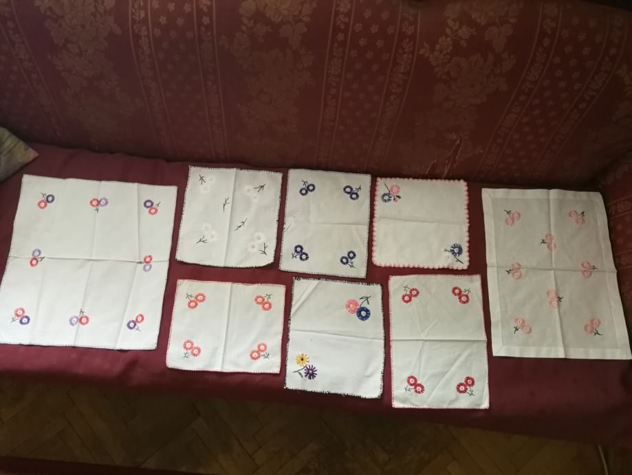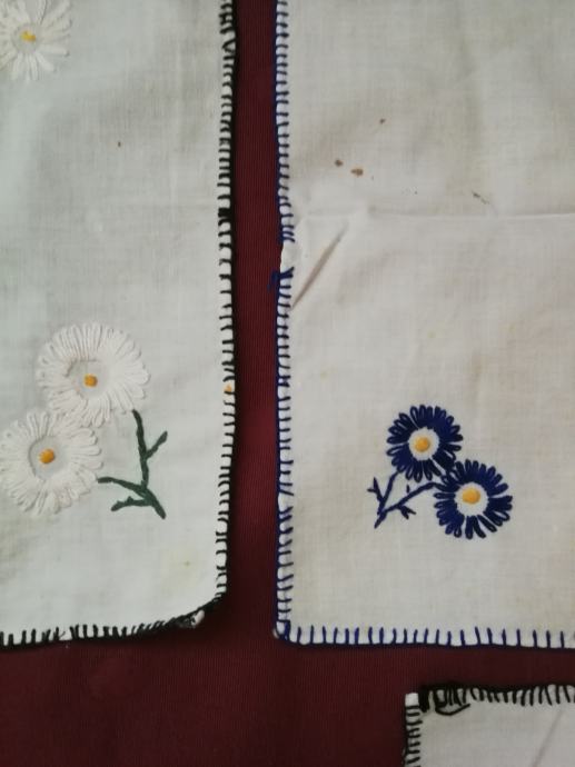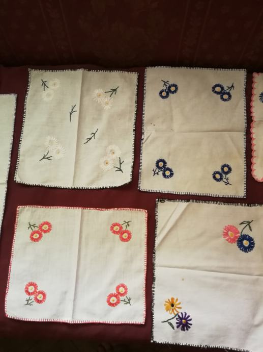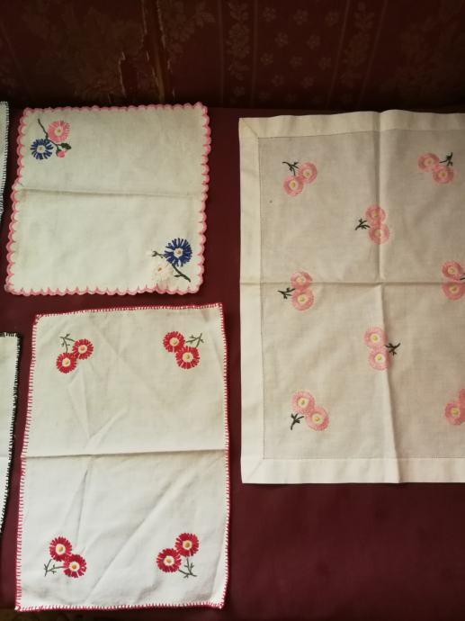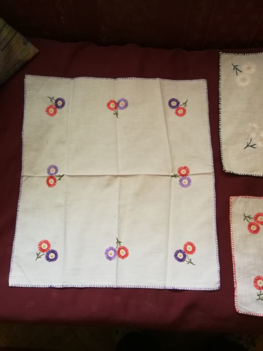 Dva podmetača dimenzija 30×30 i šest salveta dimenzija 20×25cm.,ručni rad,vezeno na platnu,starina. Isključivo u kompletu se prodaje.