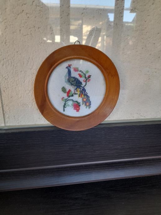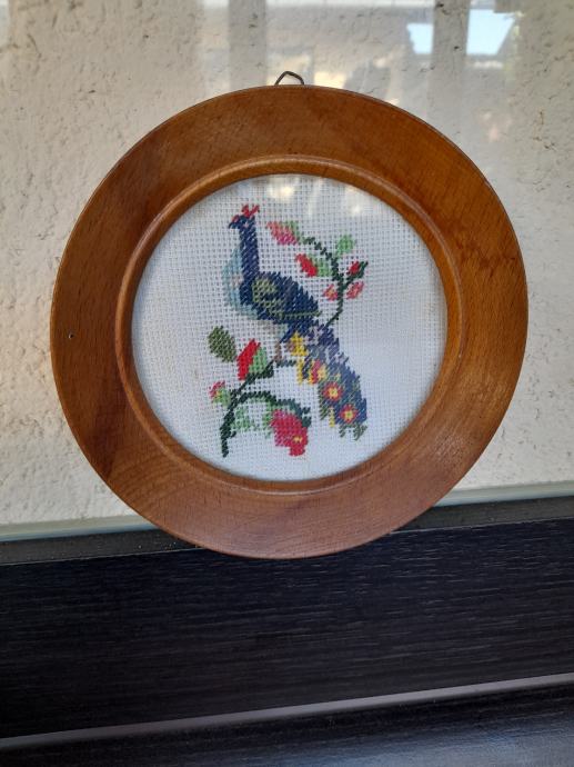 Prodajem uokvireni rucni rad , drveni okvir, promjer sa ramom je 14 cm, cijena 2 €, informacije na tel 035 260 202