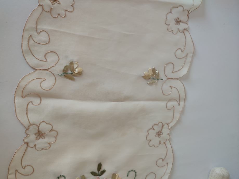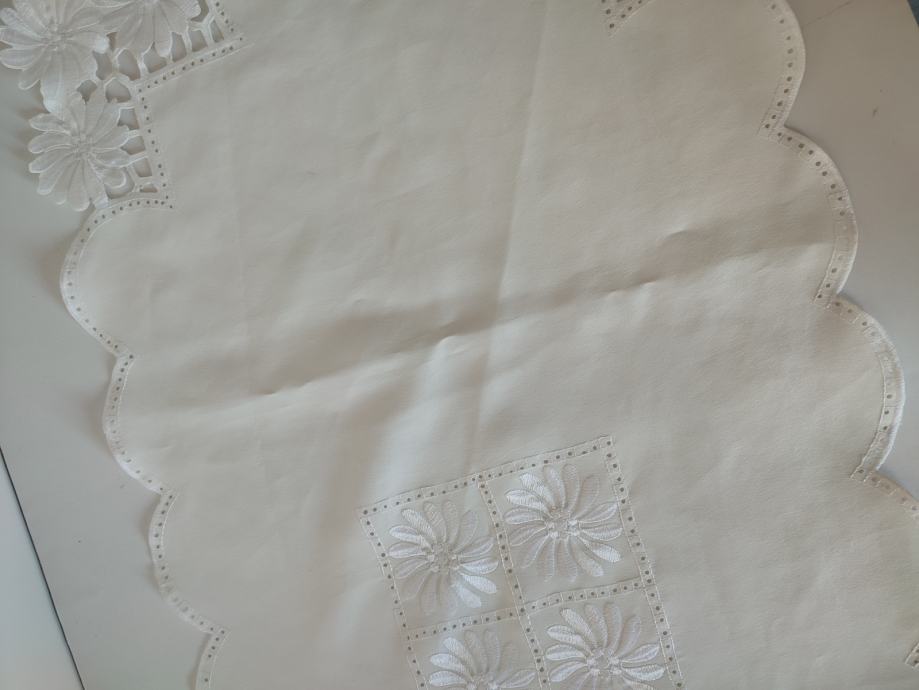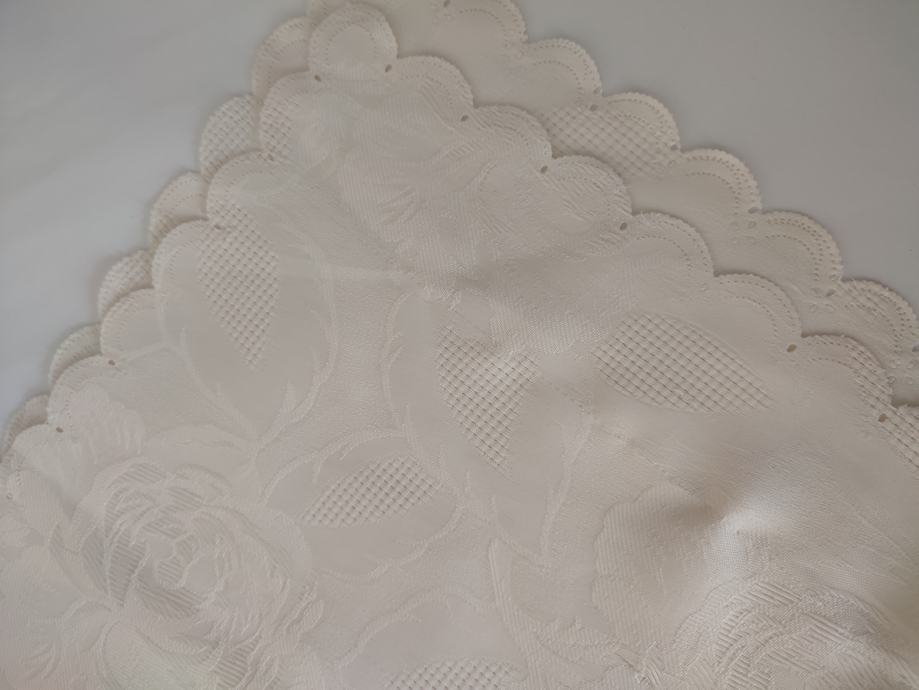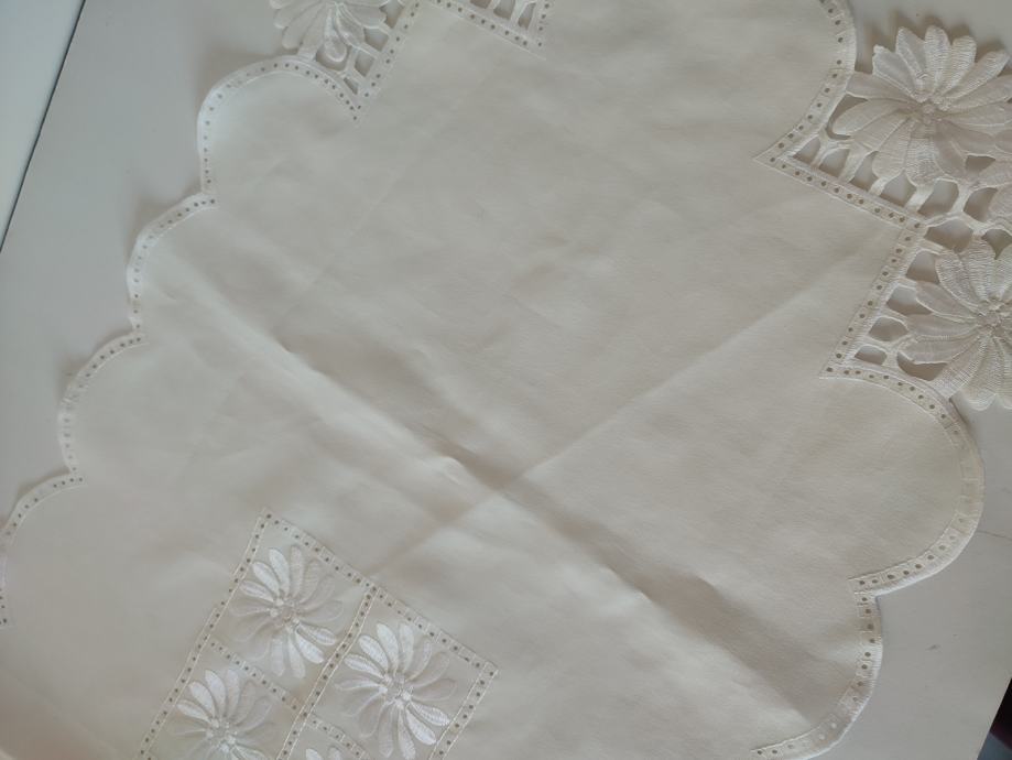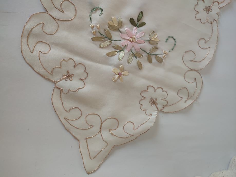 4. bijeli, duguljasti, s izvezenim cvijećem roza-zlatno i rubom zlatnih cvjetova, 80 x 77 cm (6. i 7. slika)